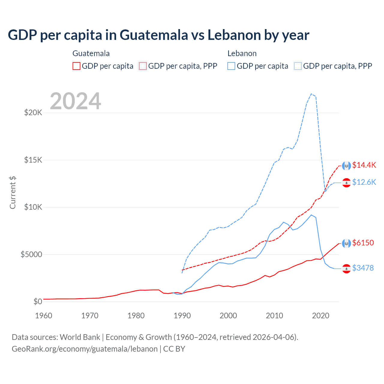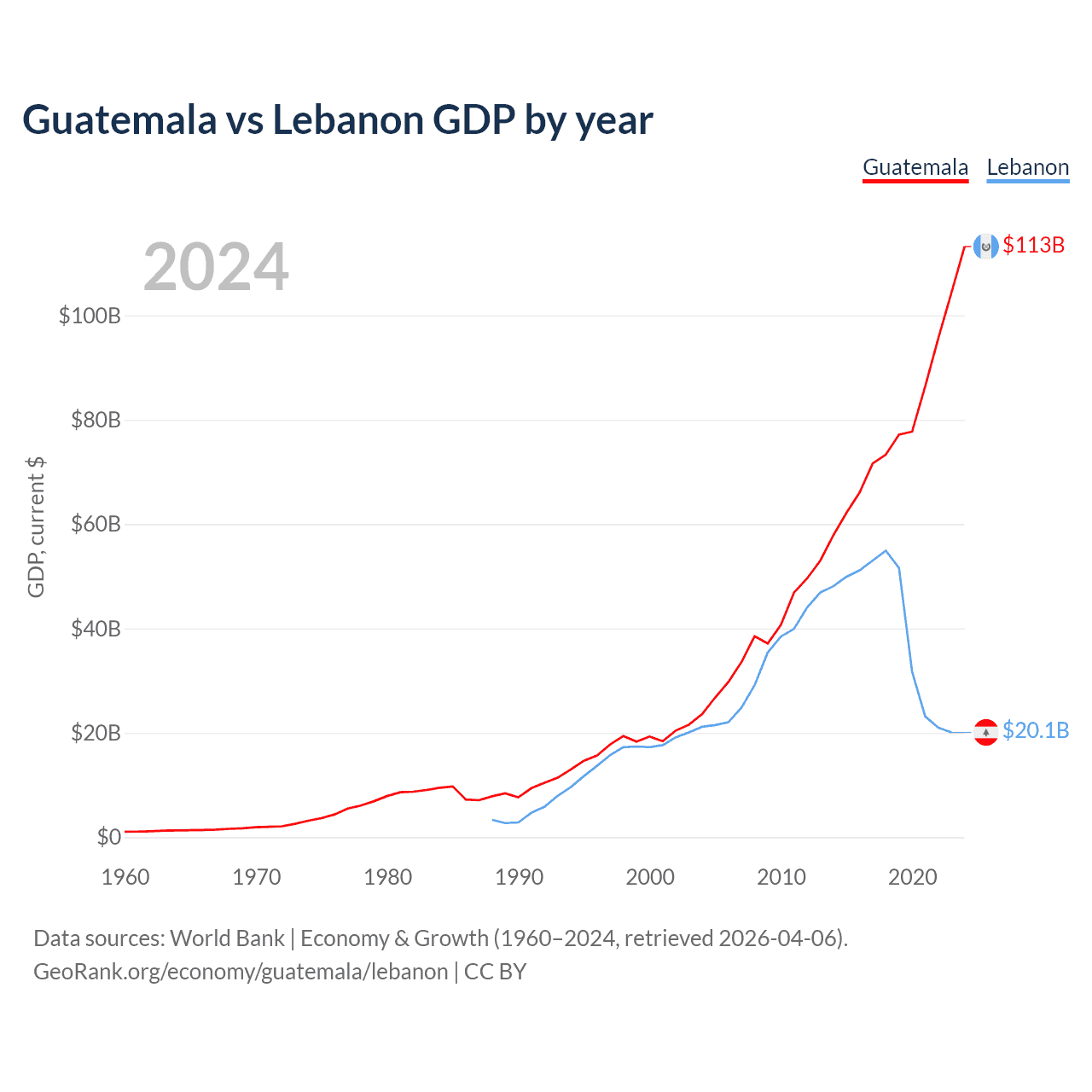 Guatemala has a GDP of $113B compared to $20.1B for Lebanon, ranking 68/197 and 128/197 by economy size, respectively.