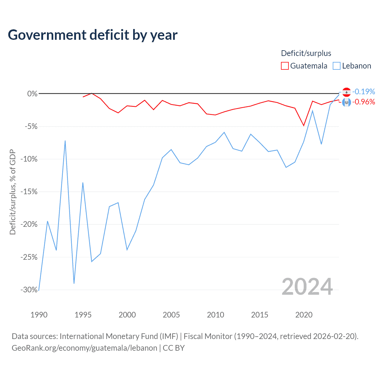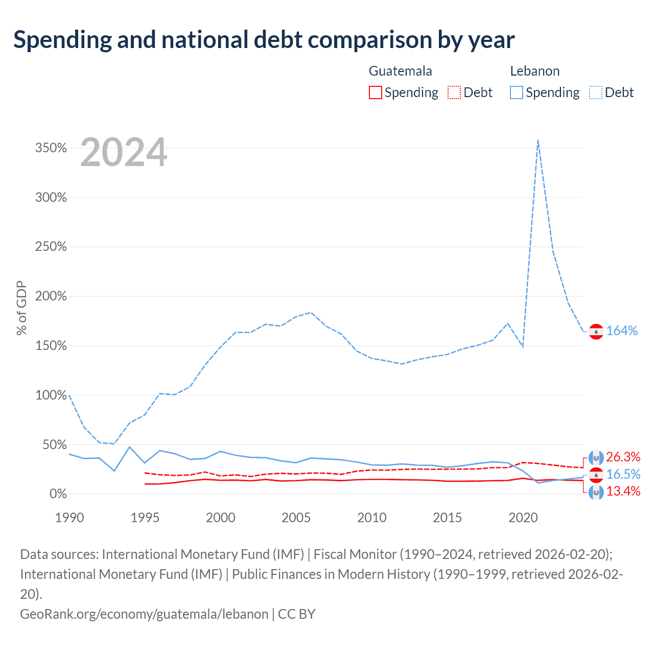 Guatemala has $29.8B in government debt (26.3% of GDP), compared to $38.7B (163.8% of GDP) in Lebanon.