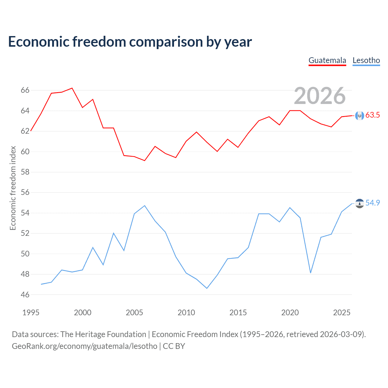 The Economic Freedom Index for Guatemala is 63.5, ranking 79/197, compared to 54.9 for Lesotho, ranking 130/197. The chart above displays a comparison of annual changes in economic freedom indexes.