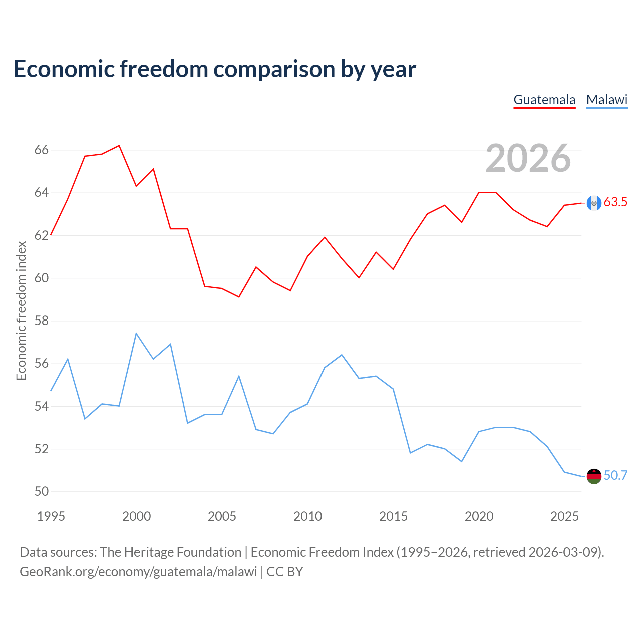 The Economic Freedom Index for Guatemala is 63.5, ranking 79/197, compared to 50.7 for Malawi, ranking 159/197. The chart above displays a comparison of annual changes in economic freedom indexes.