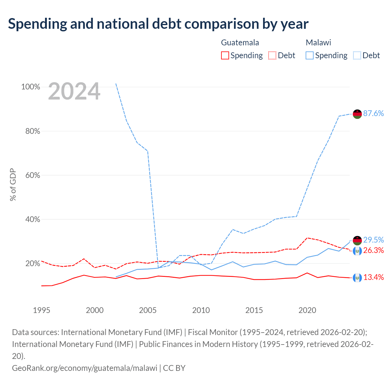 Guatemala has $29.8B in government debt (26.3% of GDP), compared to $9.91B (87.6% of GDP) in Malawi.