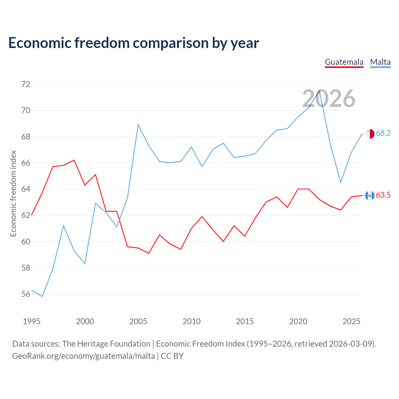The Economic Freedom Index for Guatemala is 63.5, ranking 79/197, compared to 68.2 for Malta, ranking 49/197. The chart above displays a comparison of annual changes in economic freedom indexes.