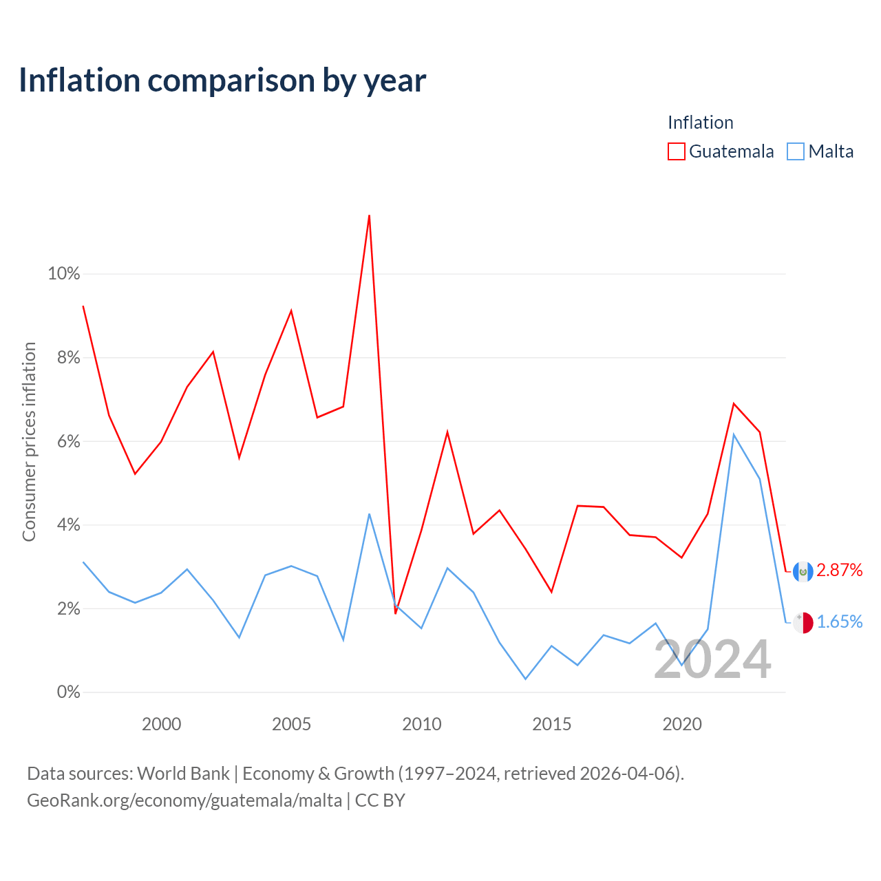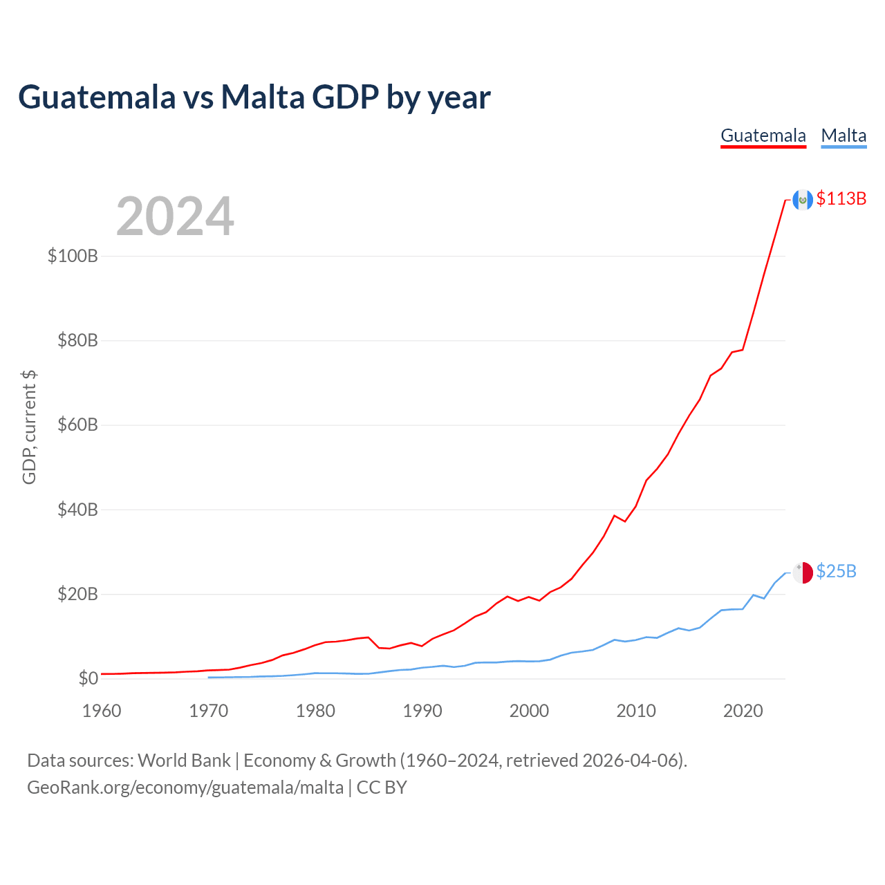 Guatemala has a GDP of $113B compared to $25B for Malta, ranking 68/197 and 119/197 by economy size, respectively.