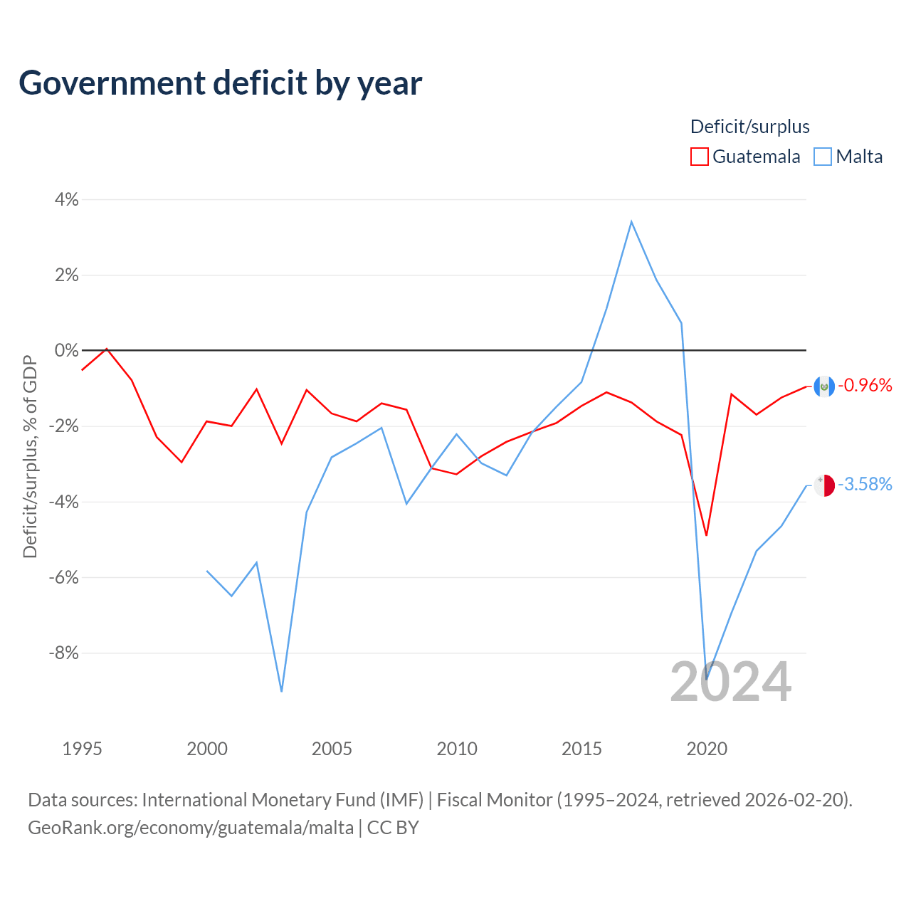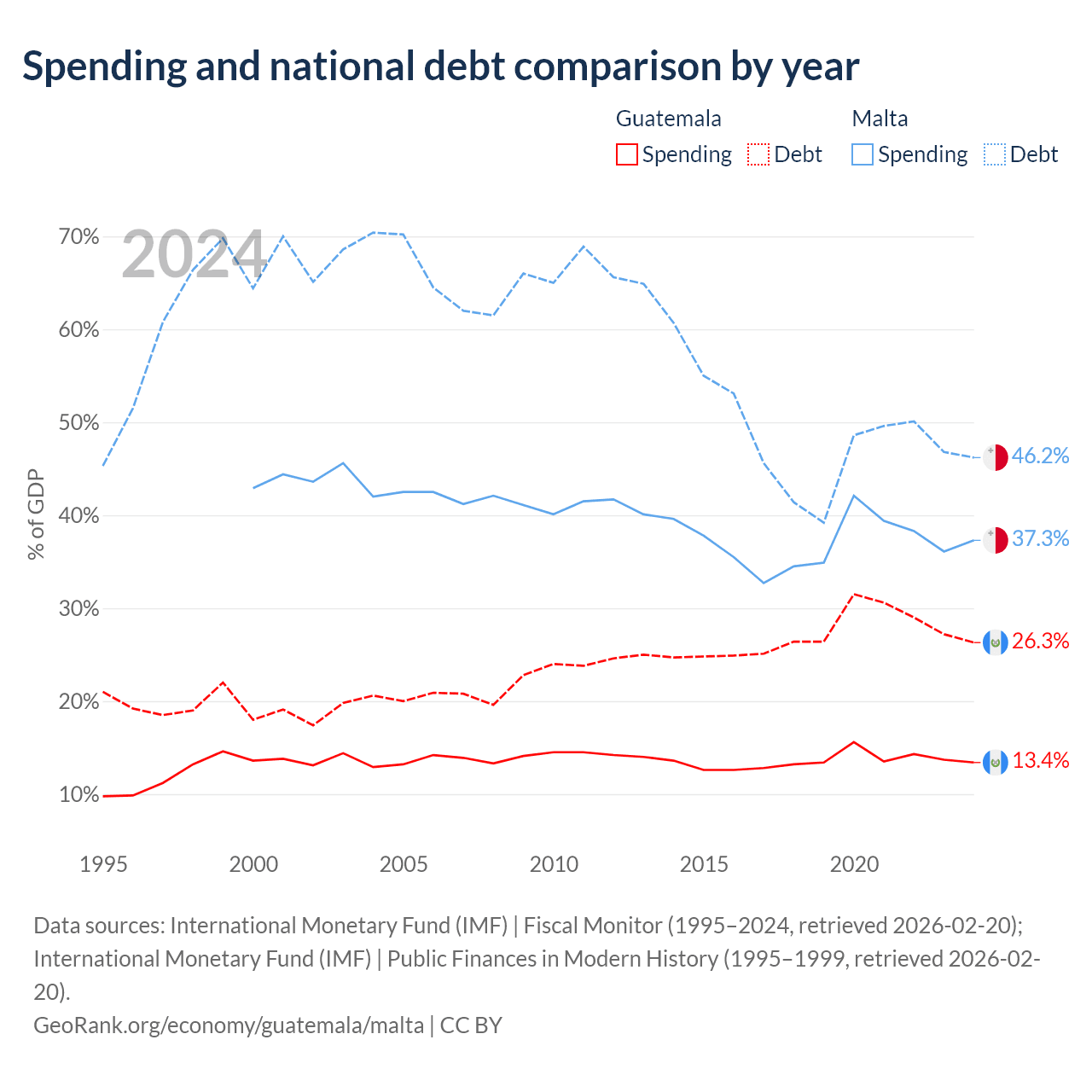Guatemala has $29.8B in government debt (26.3% of GDP), compared to $11.5B (46.2% of GDP) in Malta.