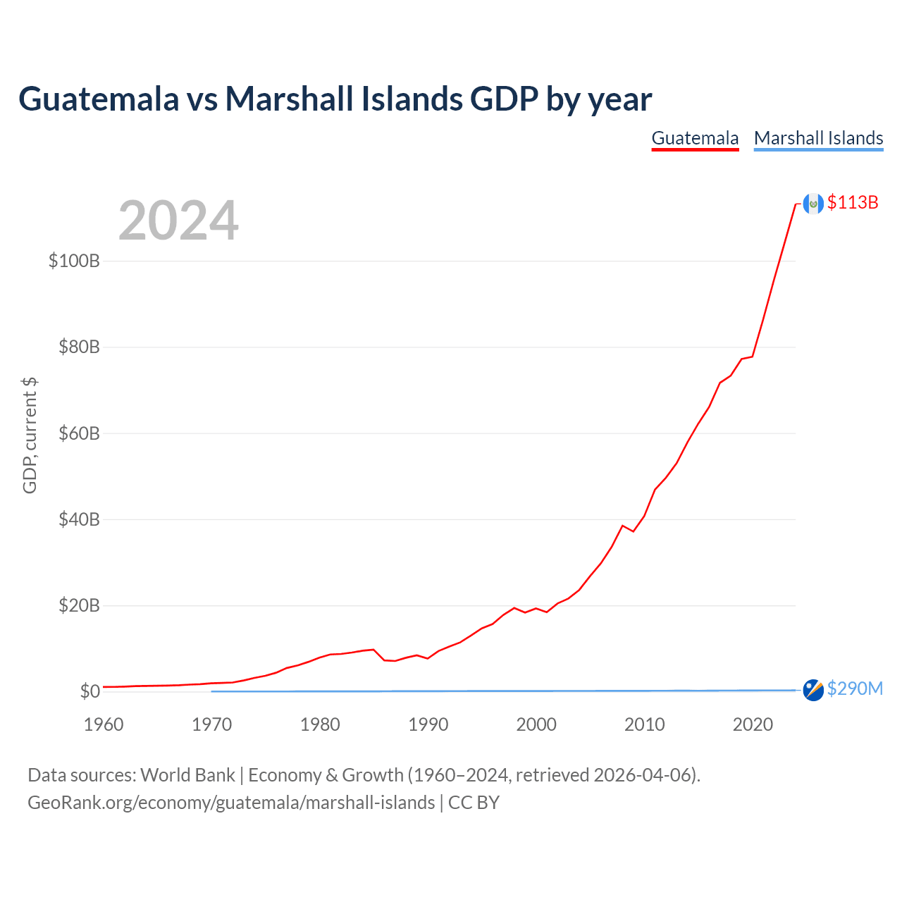 Guatemala has a GDP of $113B compared to $290M for the Marshall Islands, ranking 68/197 and 193/197 by economy size, respectively.