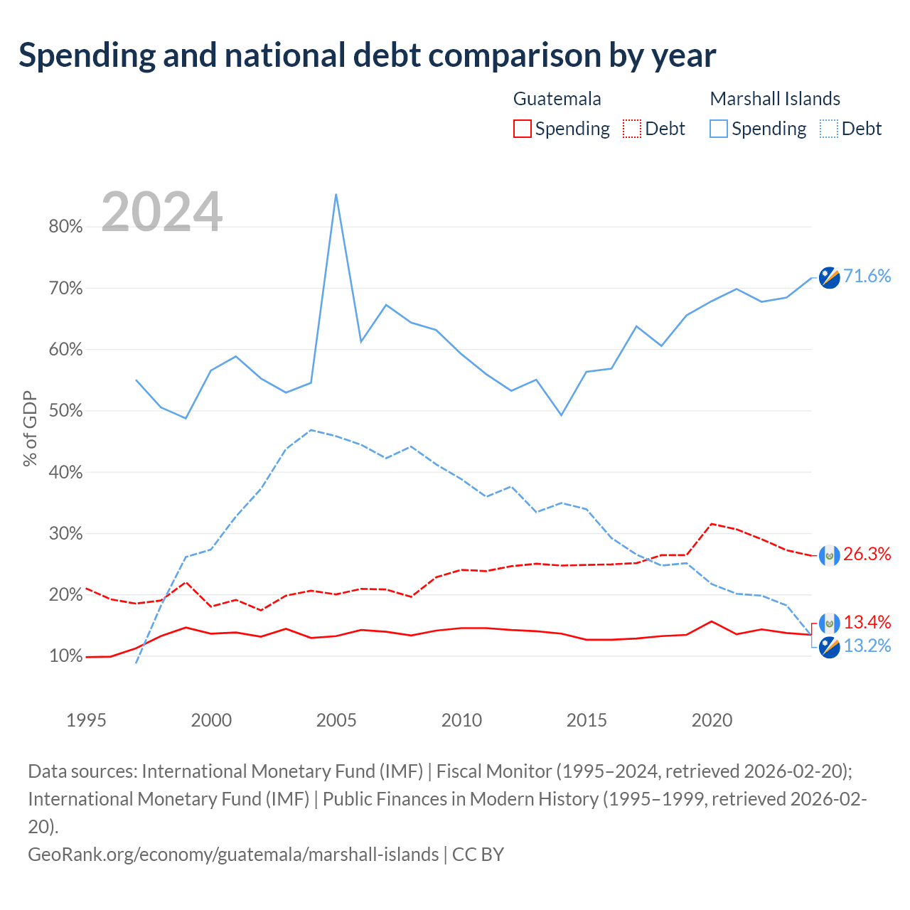 Guatemala has $29.8B in government debt (26.3% of GDP), compared to $38.4M (13.2% of GDP) in the Marshall Islands.