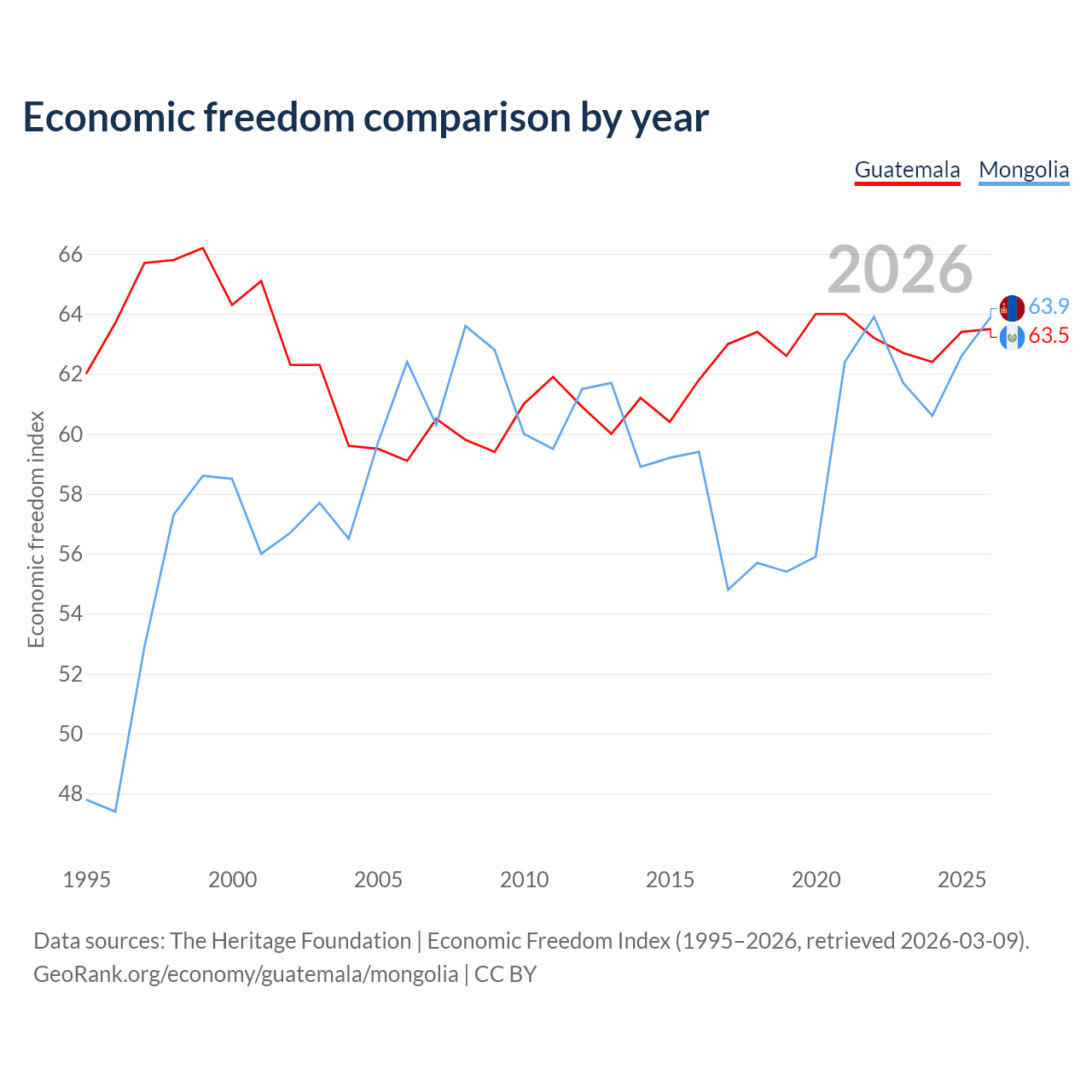 The Economic Freedom Index for Guatemala is 63.5, ranking 79/197, compared to 63.9 for Mongolia, ranking 76/197. The chart above displays a comparison of annual changes in economic freedom indexes.