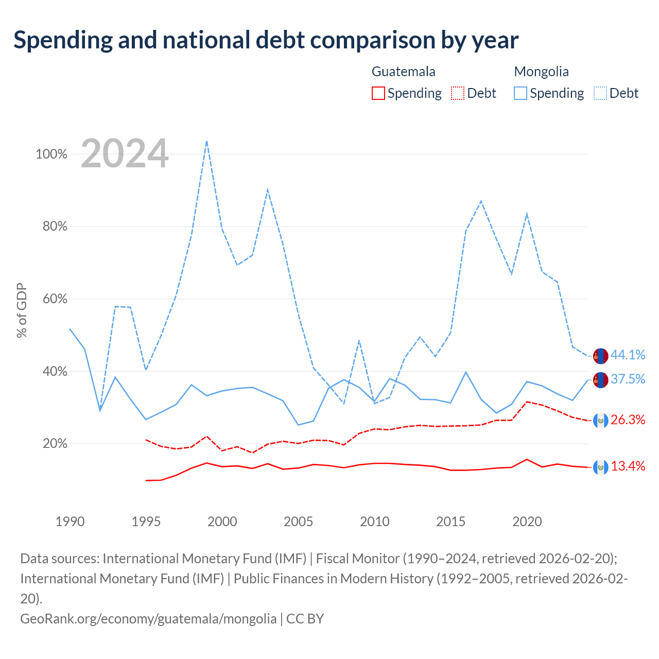 Guatemala has $29.8B in government debt (26.3% of GDP), compared to $10.5B (44.1% of GDP) in Mongolia.