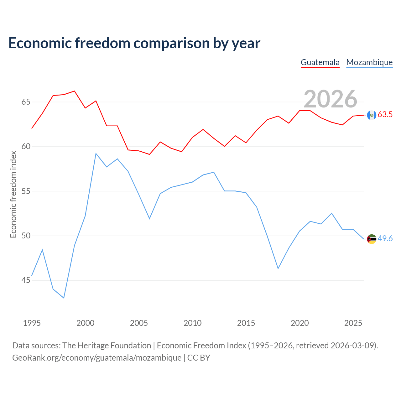 The Economic Freedom Index for Guatemala is 63.5, ranking 79/197, compared to 49.6 for Mozambique, ranking 164/197. The chart above displays a comparison of annual changes in economic freedom indexes.