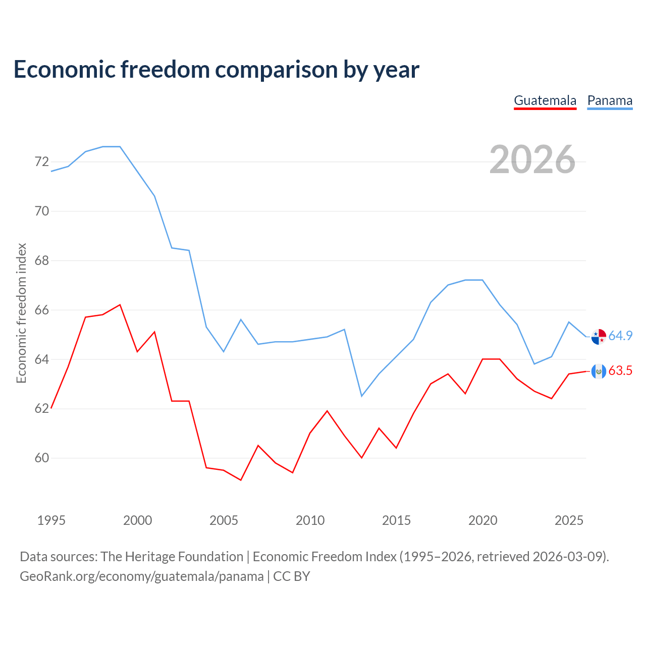 The Economic Freedom Index for Guatemala is 63.5, ranking 79/197, compared to 64.9 for Panama, ranking 70/197. The chart above displays a comparison of annual changes in economic freedom indexes.