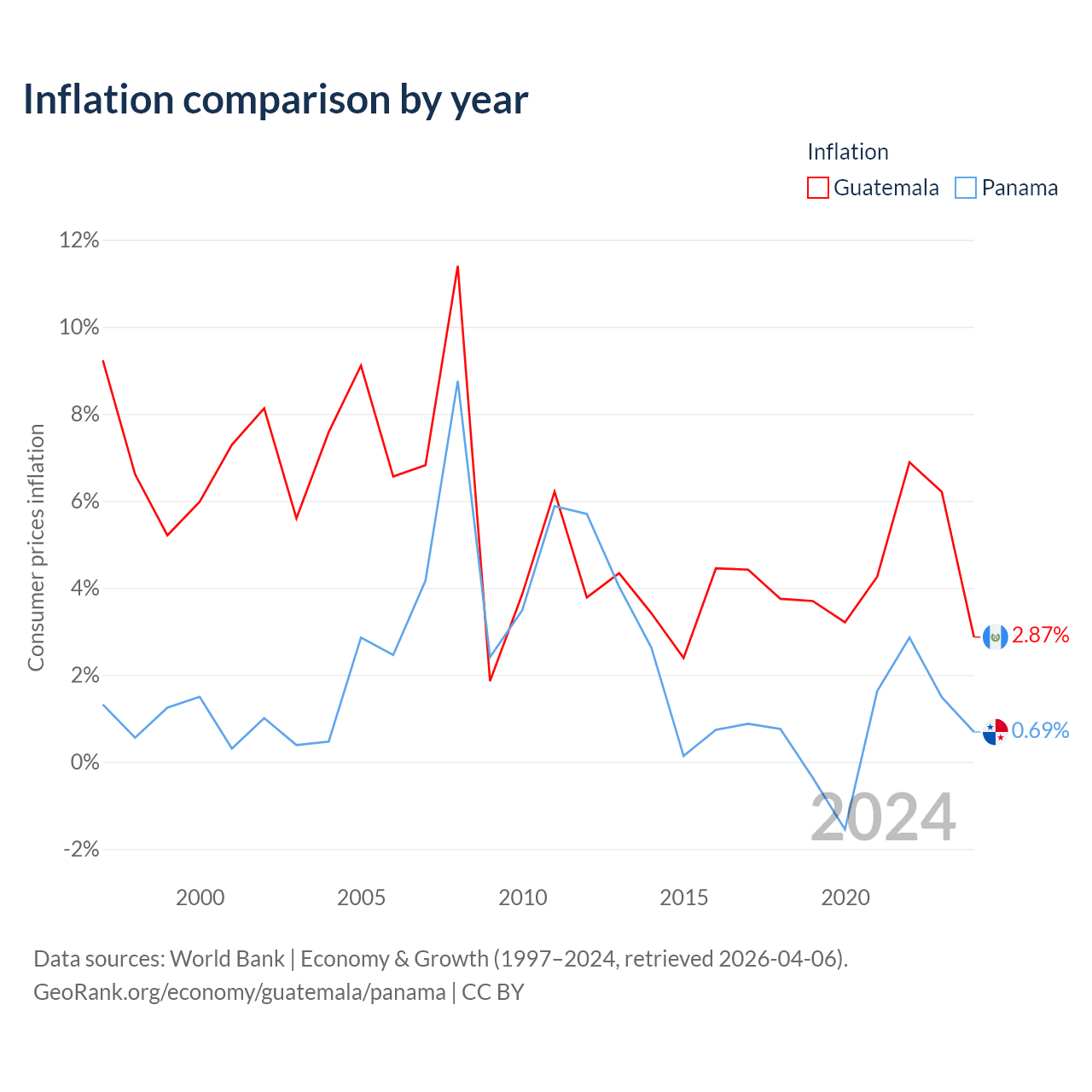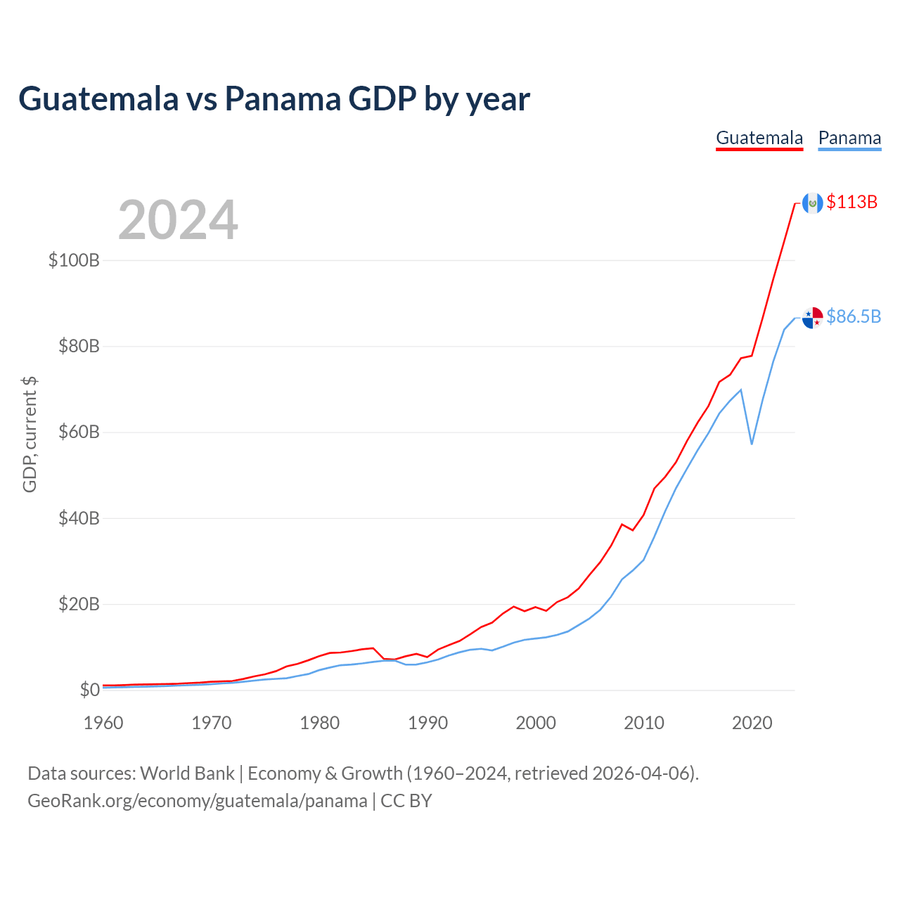 Guatemala has a GDP of $113B compared to $86.5B for Panama, ranking 68/197 and 78/197 by economy size, respectively.