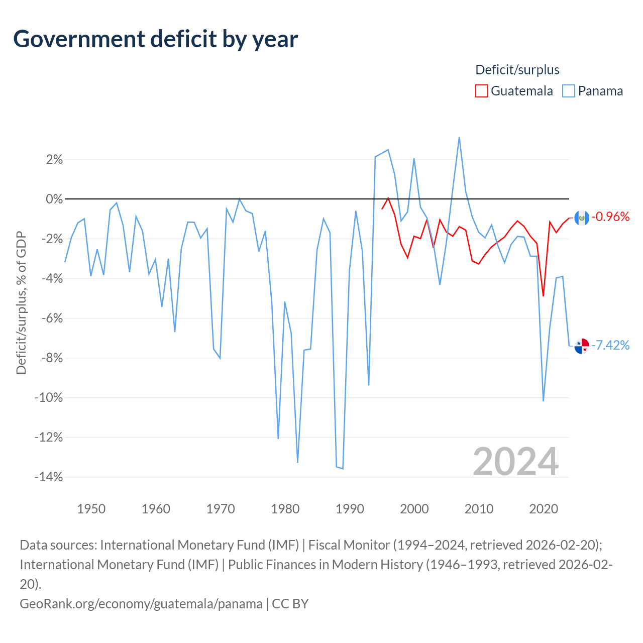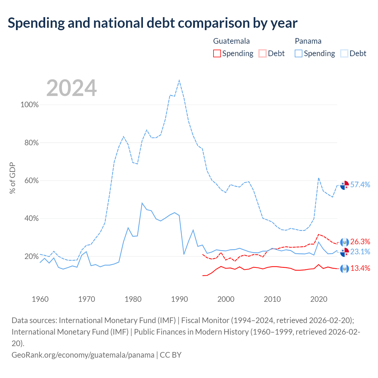 Guatemala has $29.8B in government debt (26.3% of GDP), compared to $49.6B (57.4% of GDP) in Panama.