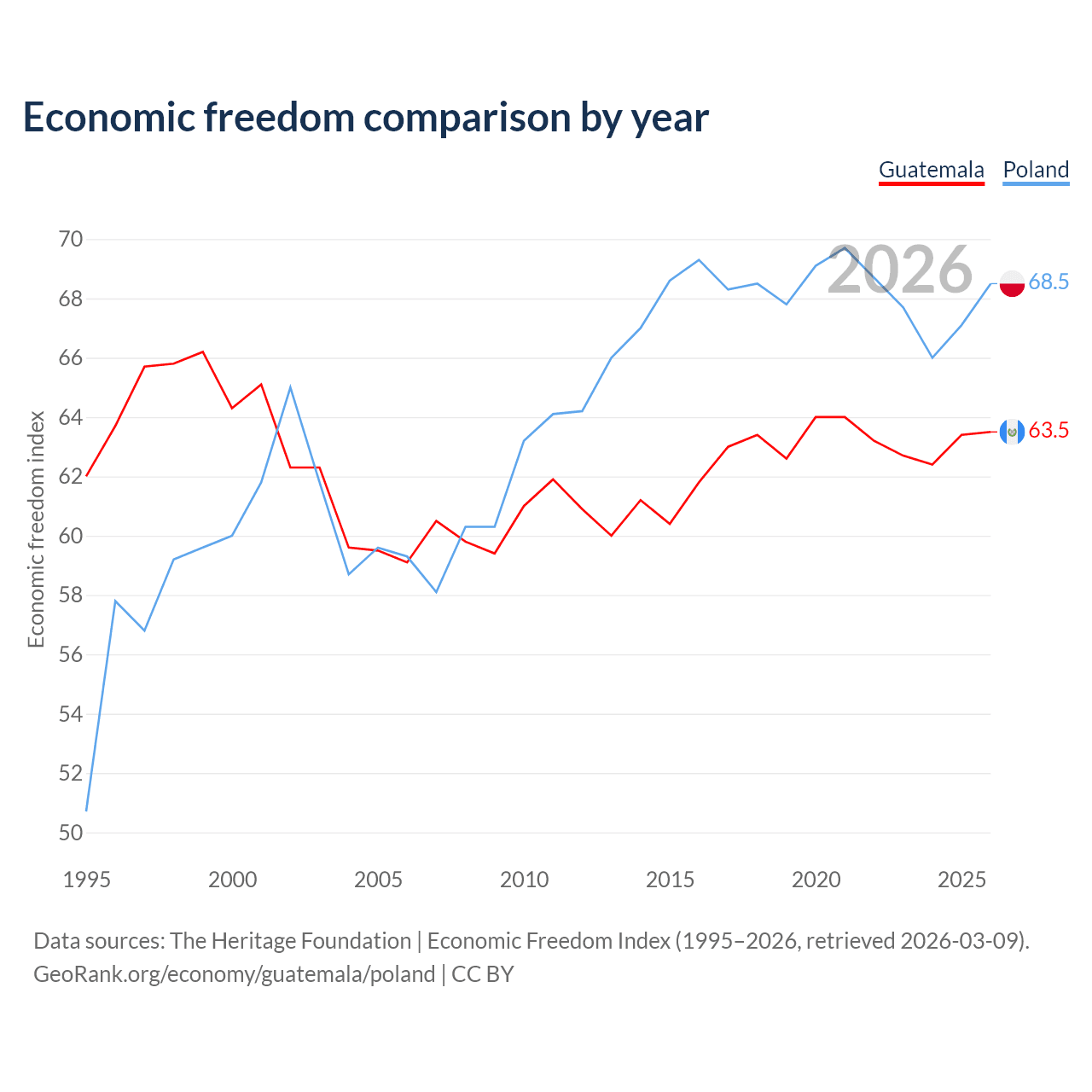 The Economic Freedom Index for Guatemala is 63.5, ranking 79/197, compared to 68.5 for Poland, ranking 46/197. The chart above displays a comparison of annual changes in economic freedom indexes.