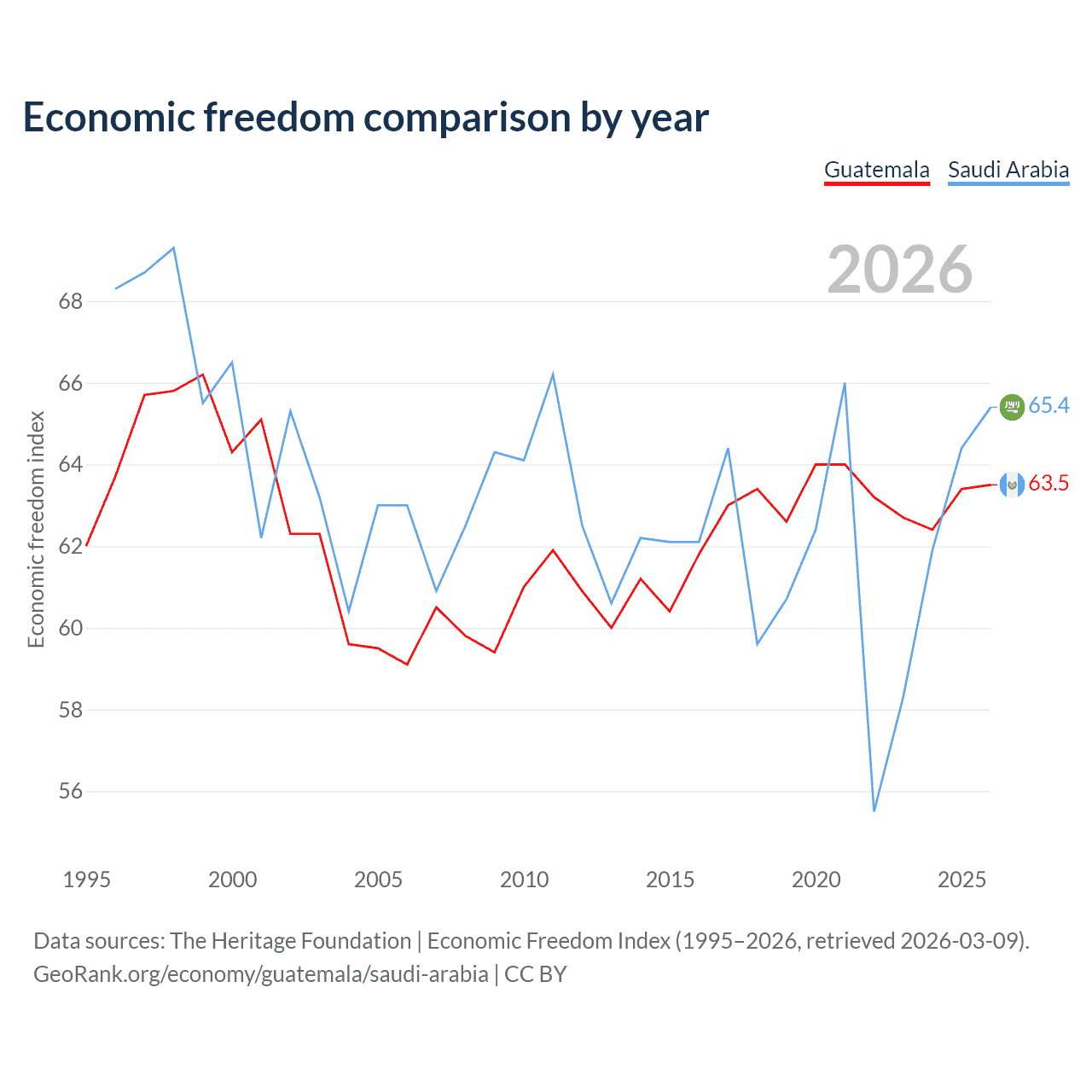 The Economic Freedom Index for Guatemala is 63.5, ranking 79/197, compared to 65.4 for Saudi Arabia, ranking 65/197. The chart above displays a comparison of annual changes in economic freedom indexes.
