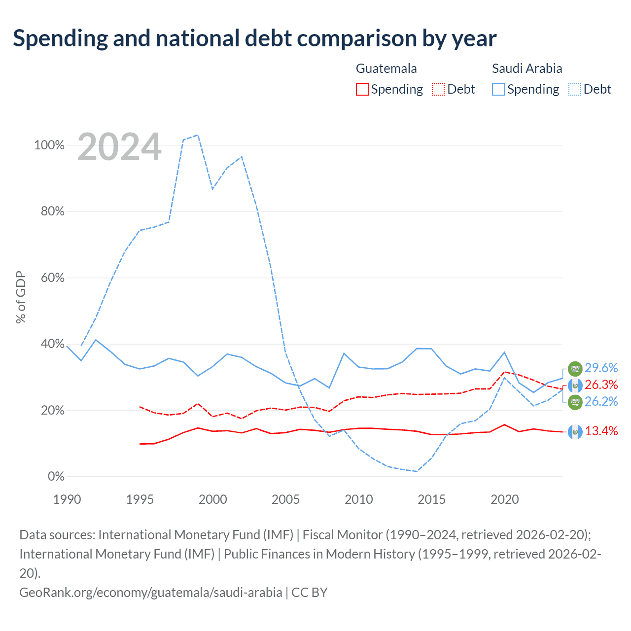 Guatemala has $29.8B in government debt (26.3% of GDP), compared to $324B (26.2% of GDP) in Saudi Arabia.