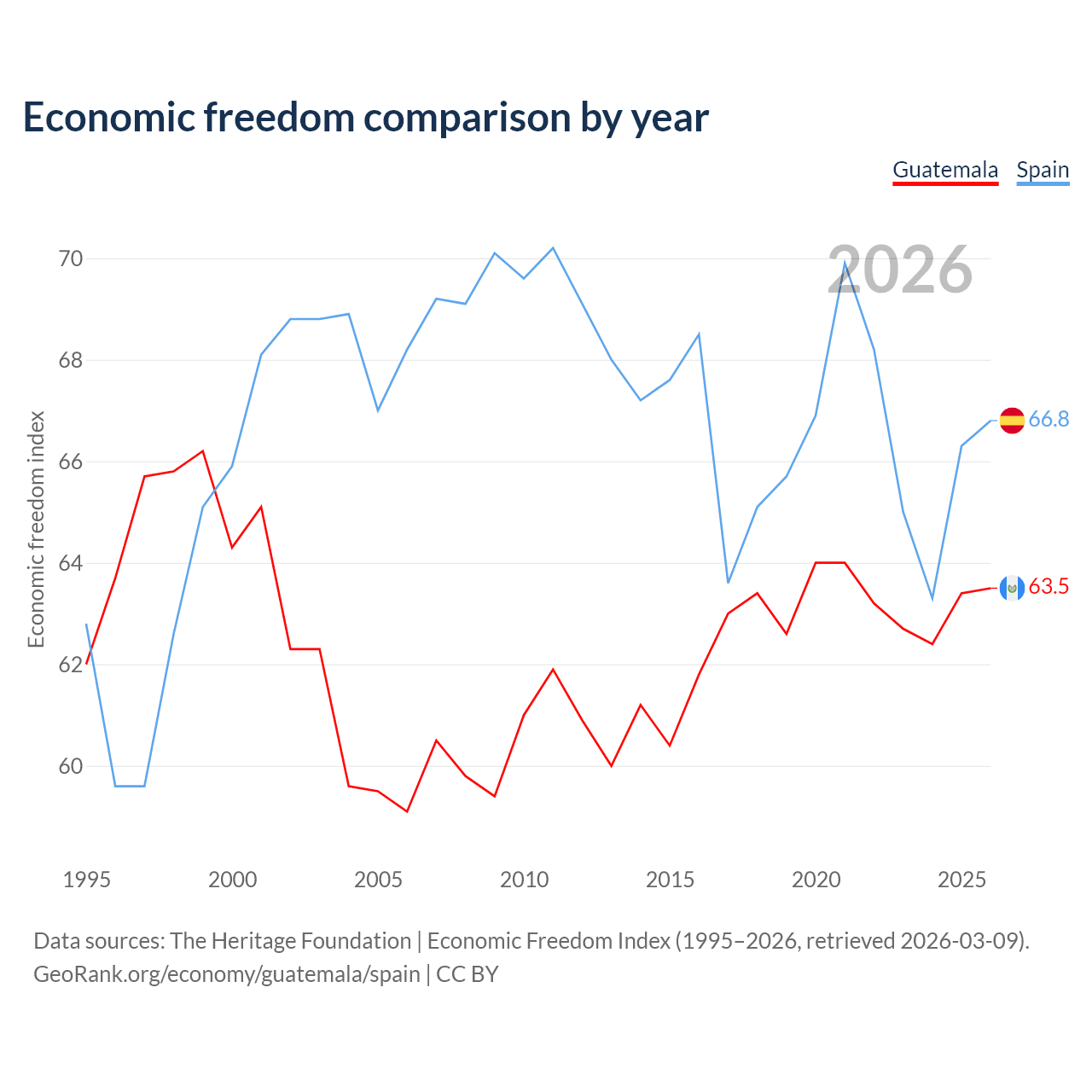 The Economic Freedom Index for Guatemala is 63.5, ranking 79/197, compared to 66.8 for Spain, ranking 59/197. The chart above displays a comparison of annual changes in economic freedom indexes.