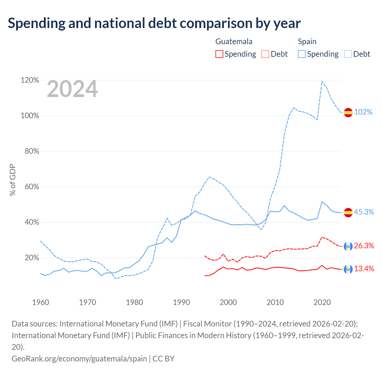 Guatemala has $29.8B in government debt (26.3% of GDP), compared to $1.75T (101.6% of GDP) in Spain.