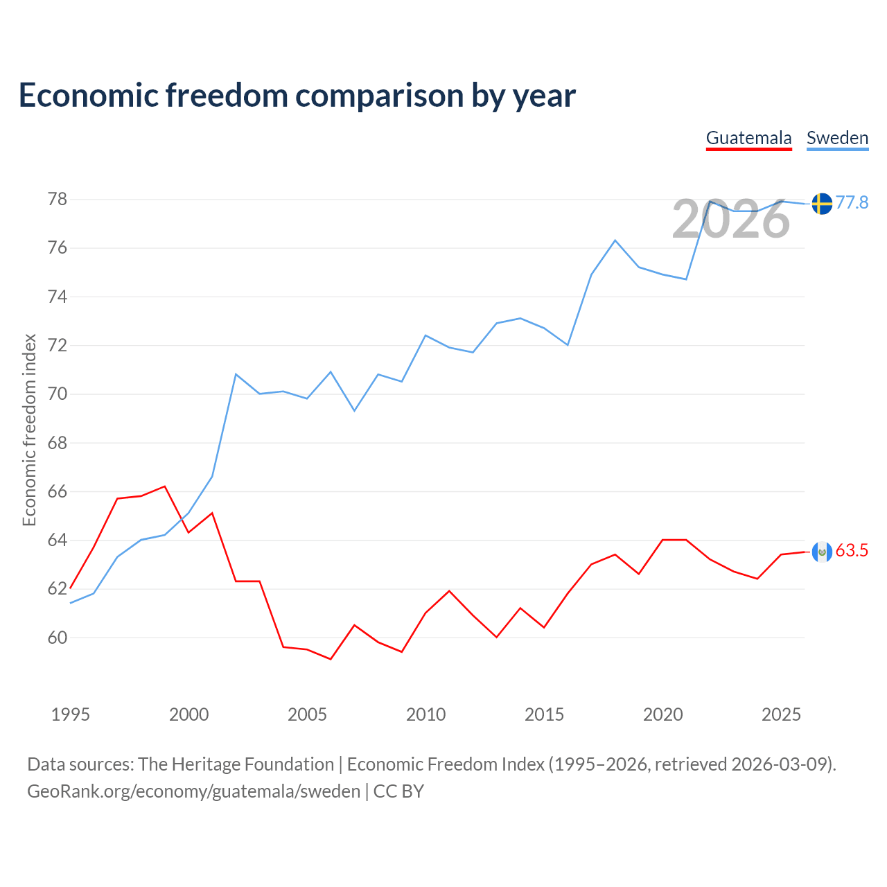 The Economic Freedom Index for Guatemala is 63.5, ranking 79/197, compared to 77.8 for Sweden, ranking 14/197. The chart above displays a comparison of annual changes in economic freedom indexes.
