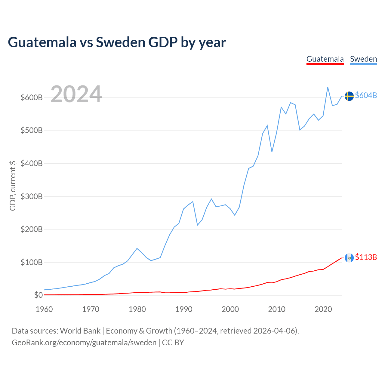 Guatemala has a GDP of $113B compared to $604B for Sweden, ranking 68/197 and 26/197 by economy size, respectively.