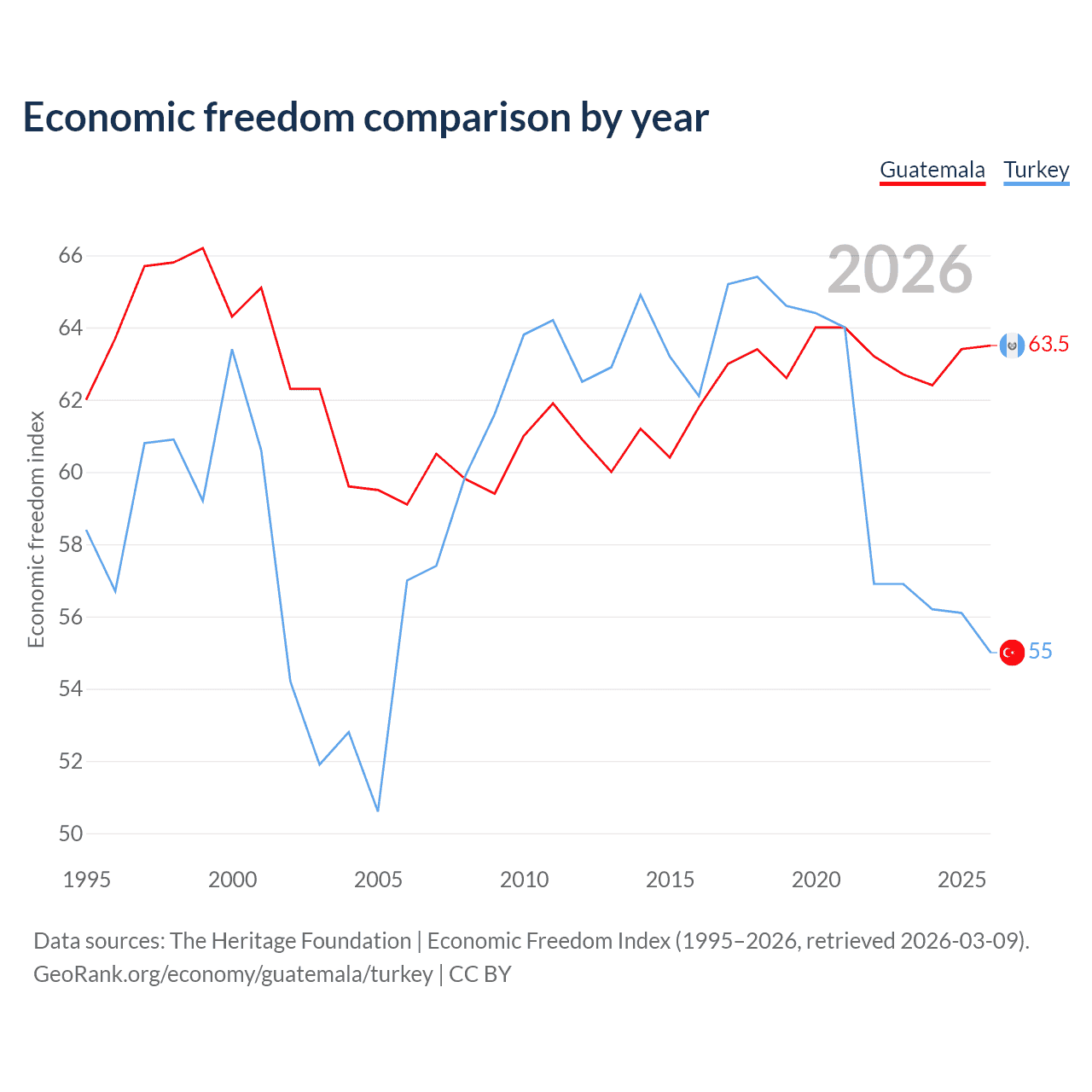 The Economic Freedom Index for Guatemala is 63.5, ranking 79/197, compared to 55 for Turkey, ranking 129/197. The chart above displays a comparison of annual changes in economic freedom indexes.