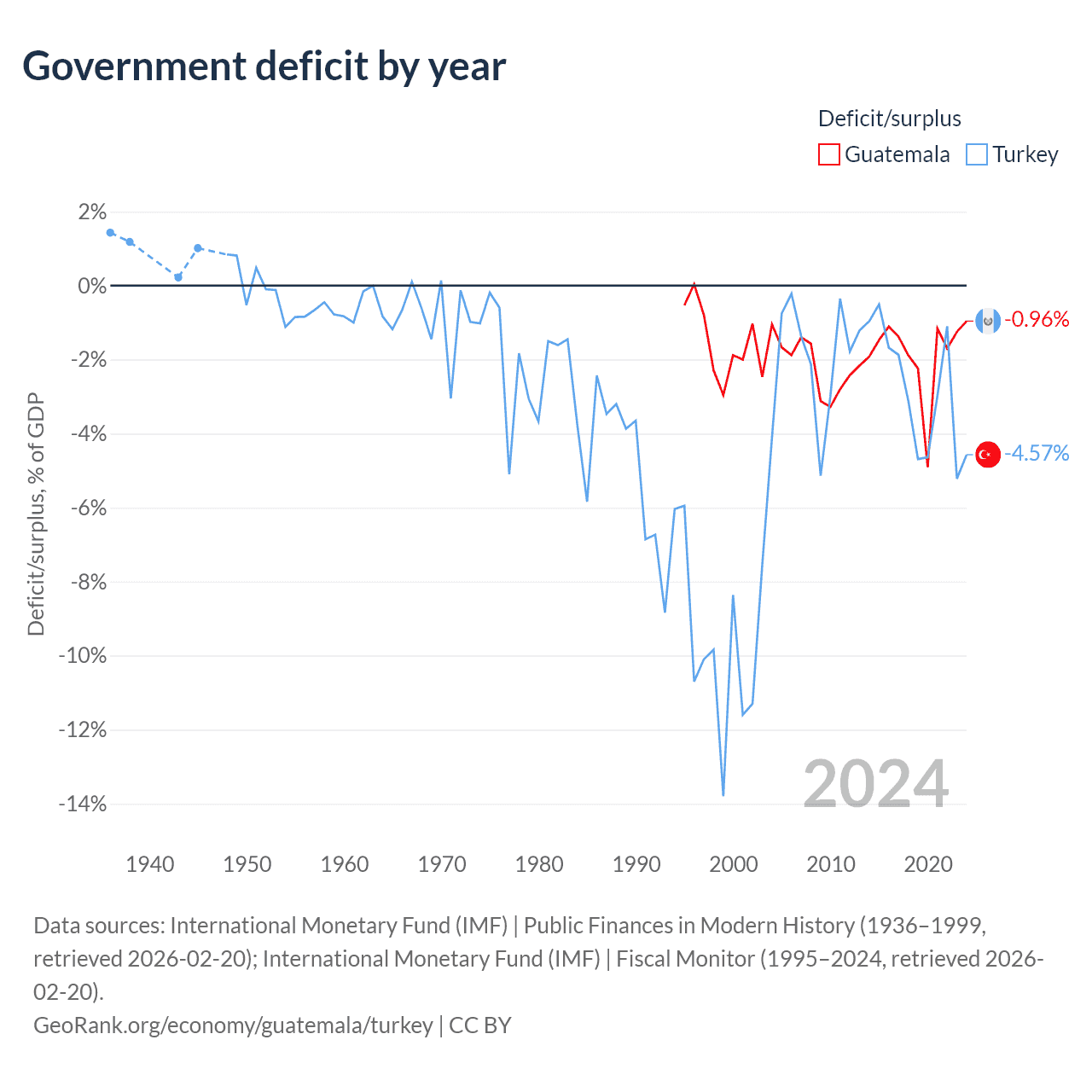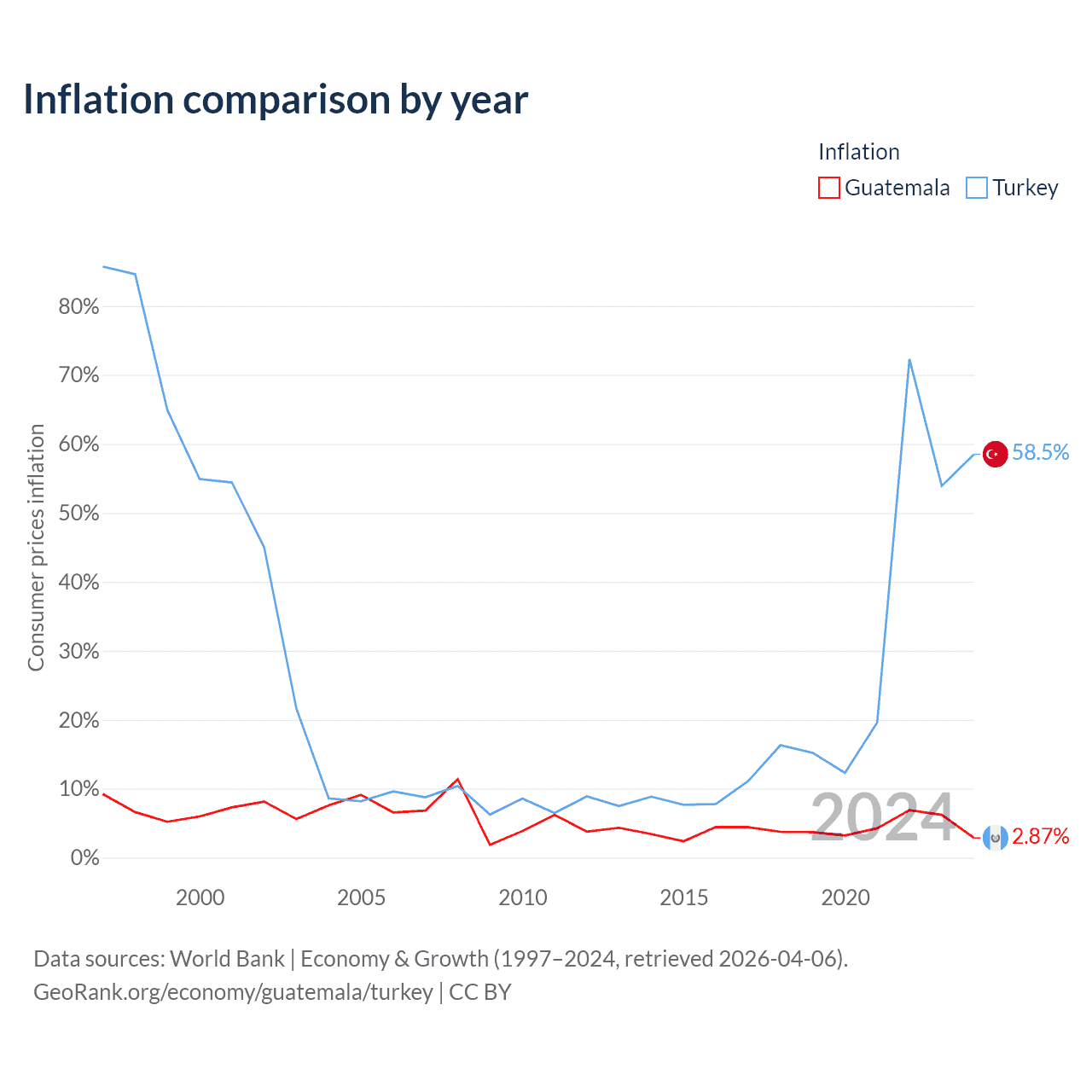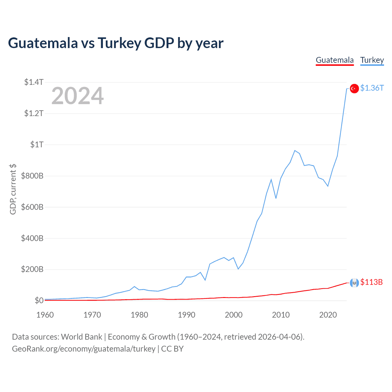 Guatemala has a GDP of $113B compared to $1.36T for Turkey, ranking 68/197 and 17/197 by economy size, respectively.