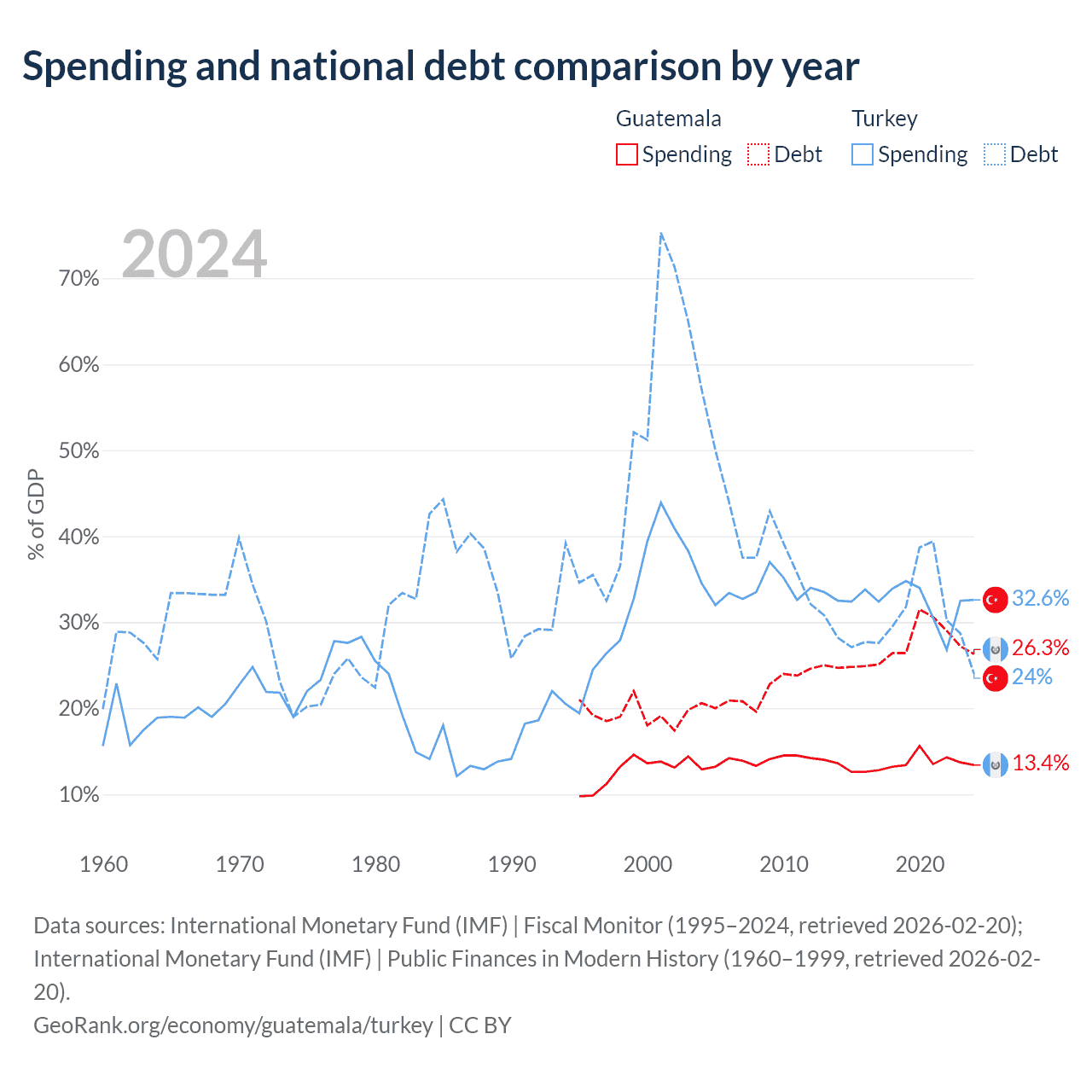 Guatemala has $29.8B in government debt (26.3% of GDP), compared to $327B (24% of GDP) in Turkey.