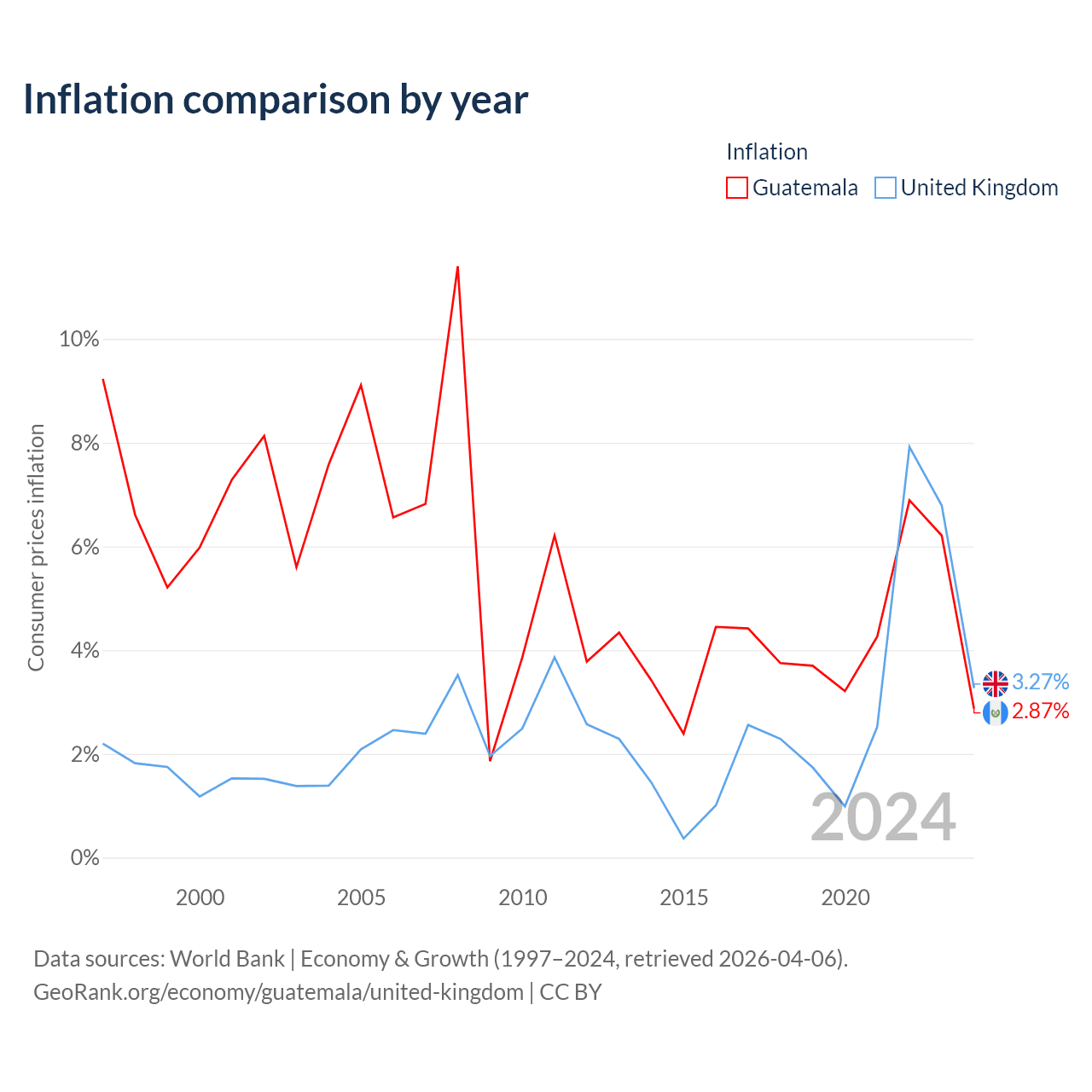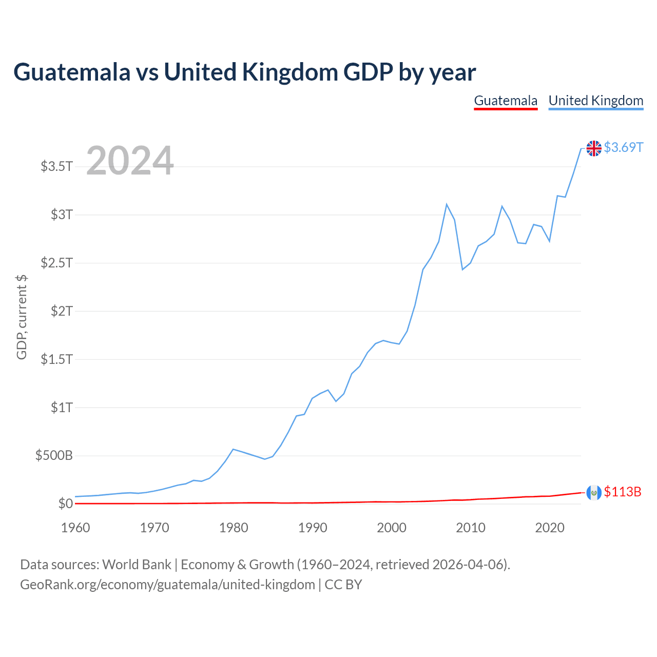 Guatemala has a GDP of $113B compared to $3.69T for the United Kingdom, ranking 68/197 and 6/197 by economy size, respectively.