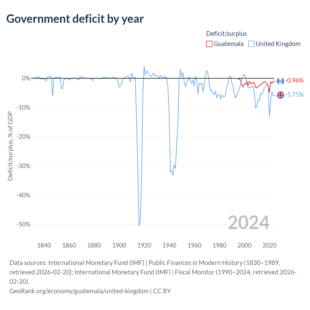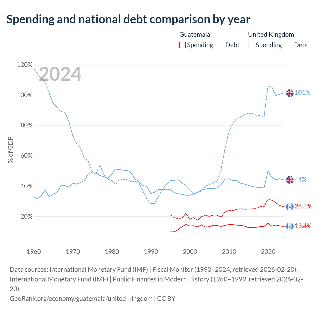 Guatemala has $29.8B in government debt (26.3% of GDP), compared to $3.73T (101.2% of GDP) in the United Kingdom.