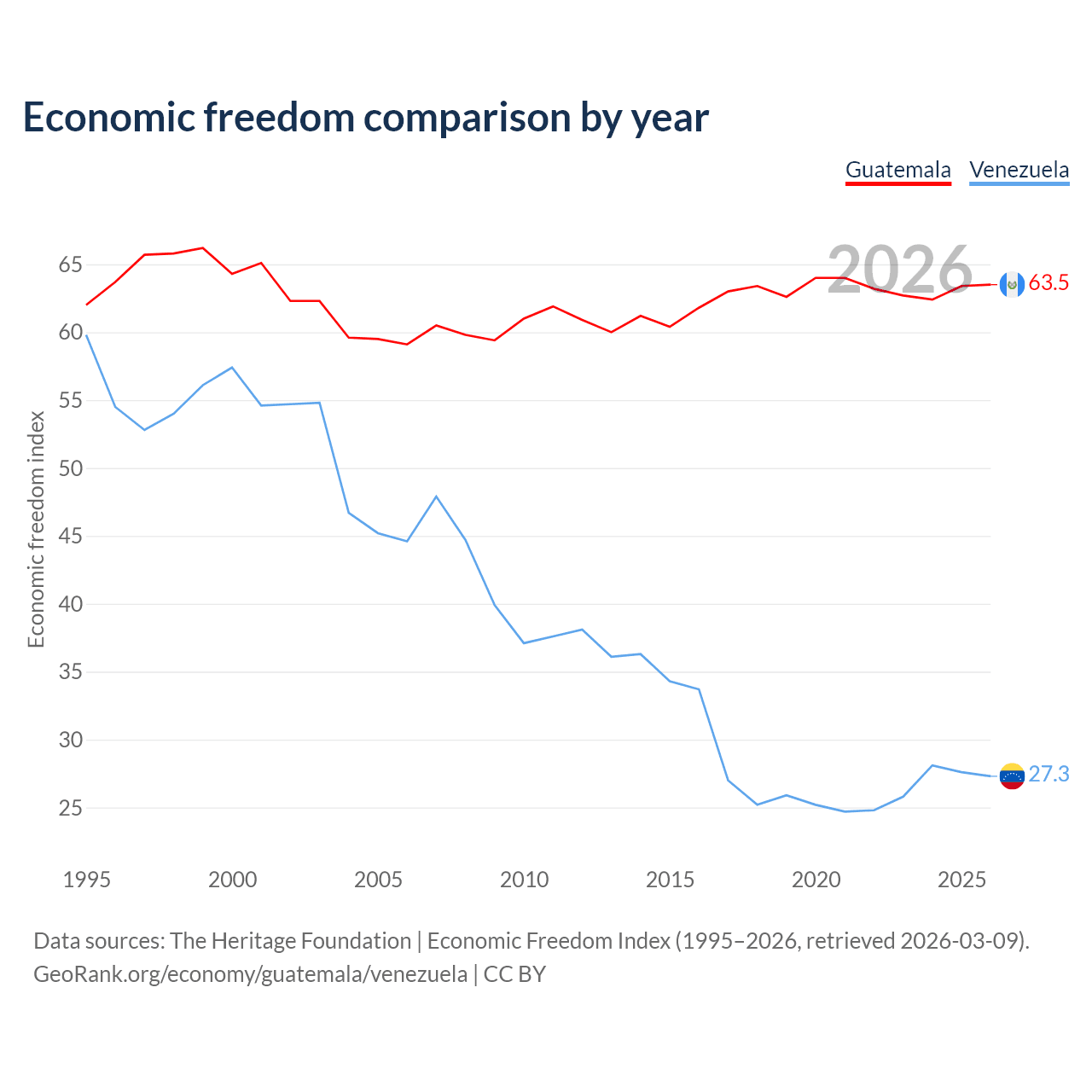 The Economic Freedom Index for Guatemala is 63.5, ranking 79/197, compared to 27.3 for Venezuela, ranking 194/197. The chart above displays a comparison of annual changes in economic freedom indexes.