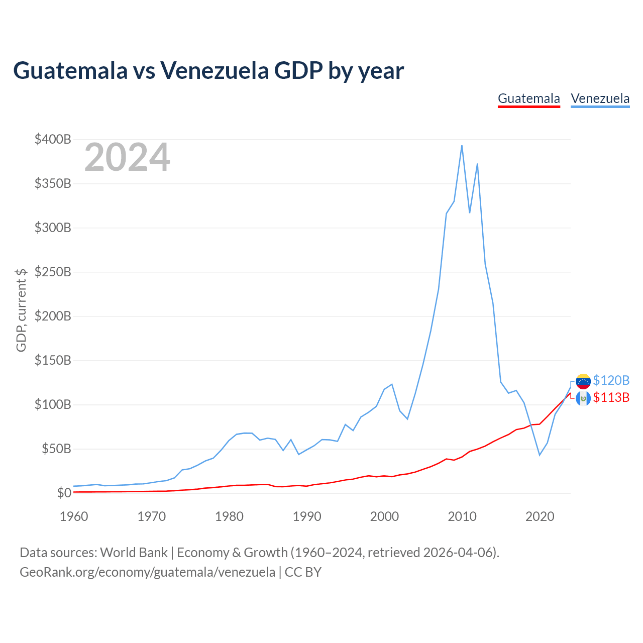 Guatemala has a GDP of $113B compared to $120B for Venezuela, ranking 68/197 and 65/197 by economy size, respectively.