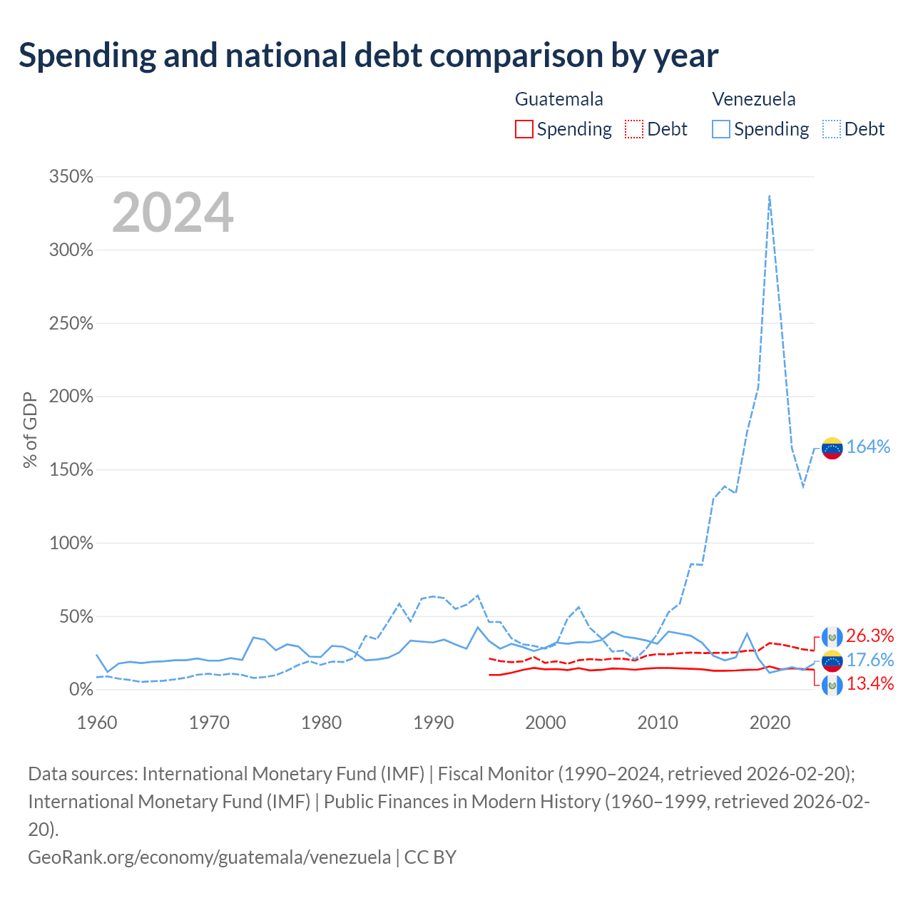 Guatemala has $29.8B in government debt (26.3% of GDP), compared to $197B (164.3% of GDP) in Venezuela.
