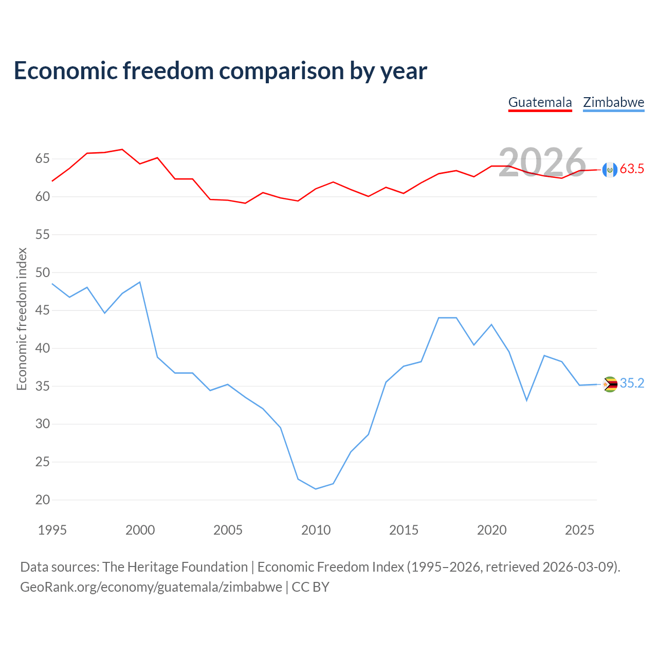 The Economic Freedom Index for Guatemala is 63.5, ranking 79/197, compared to 35.2 for Zimbabwe, ranking 190/197. The chart above displays a comparison of annual changes in economic freedom indexes.