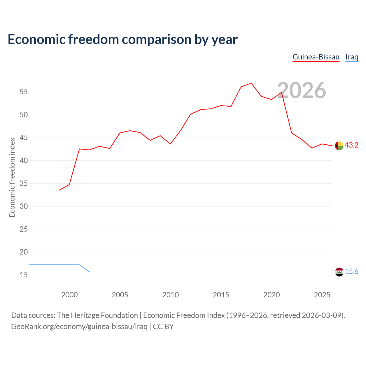 The Economic Freedom Index for Guinea-Bissau is 43.2, ranking 181/197, compared to 15.6 for Iraq, ranking 196/197. The chart above displays a comparison of annual changes in economic freedom indexes.