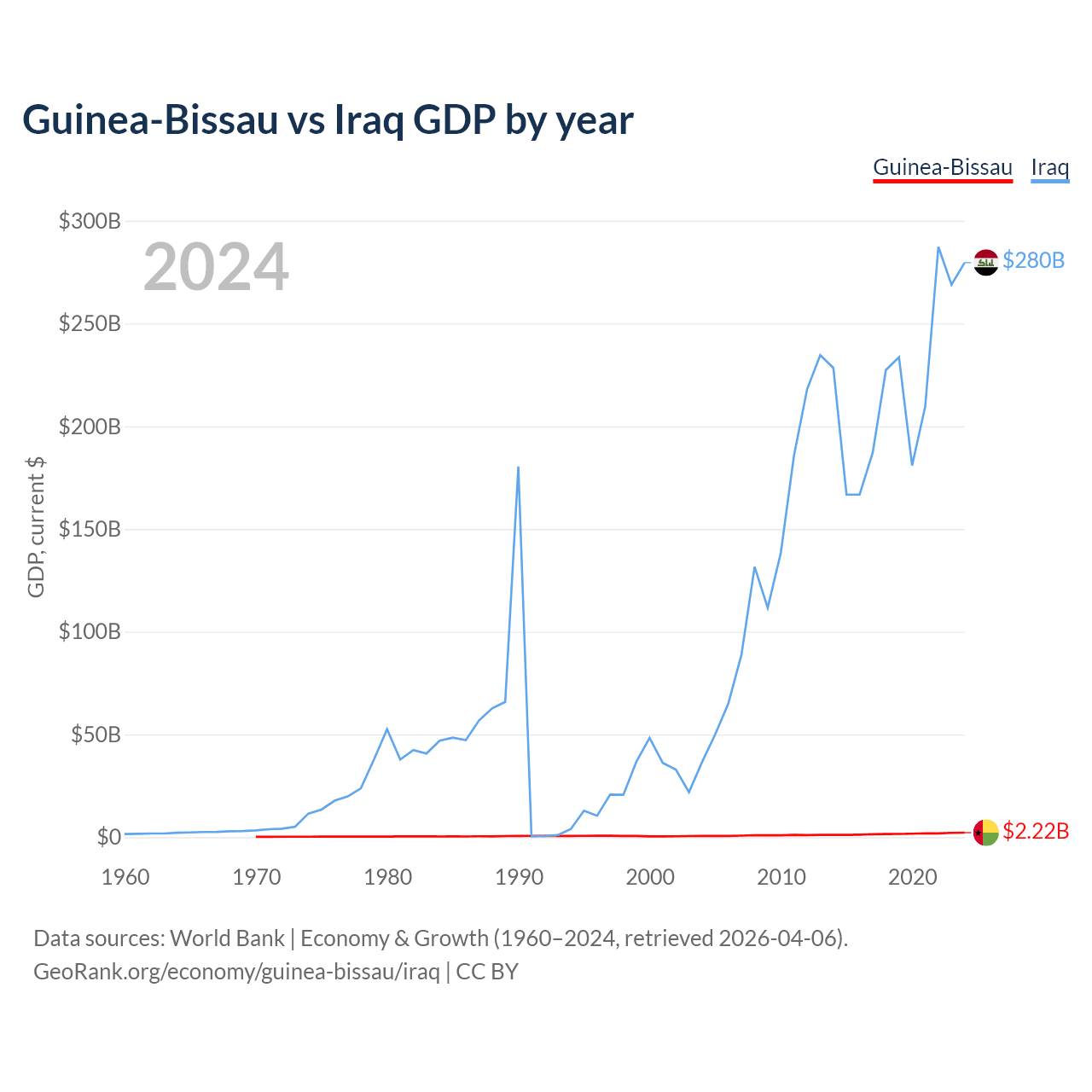 Guinea-Bissau has a GDP of $2.22B compared to $280B for Iraq, ranking 176/197 and 50/197 by economy size, respectively.