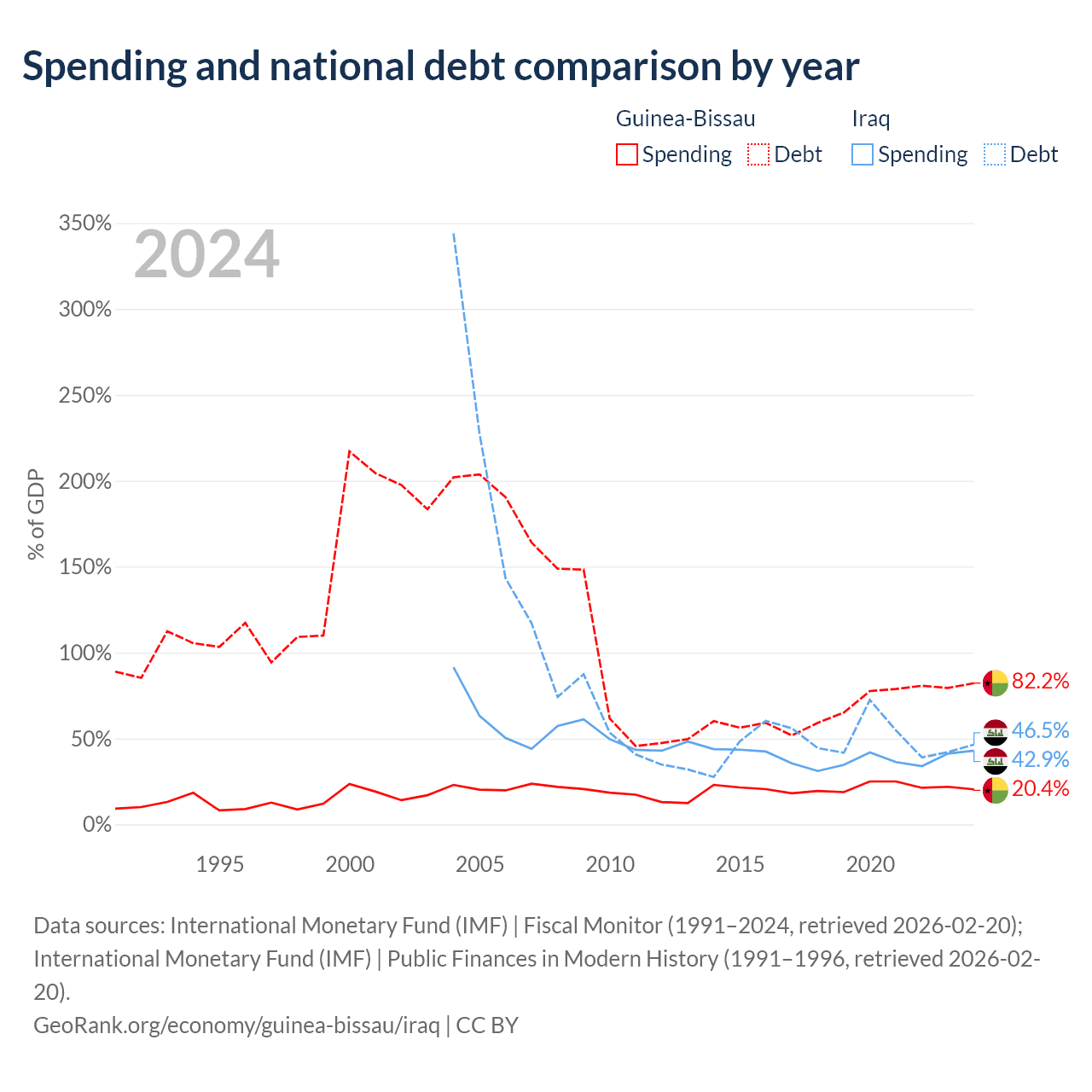 Guinea-Bissau has $1.82B in government debt (82.2% of GDP), compared to $130B (46.5% of GDP) in Iraq.