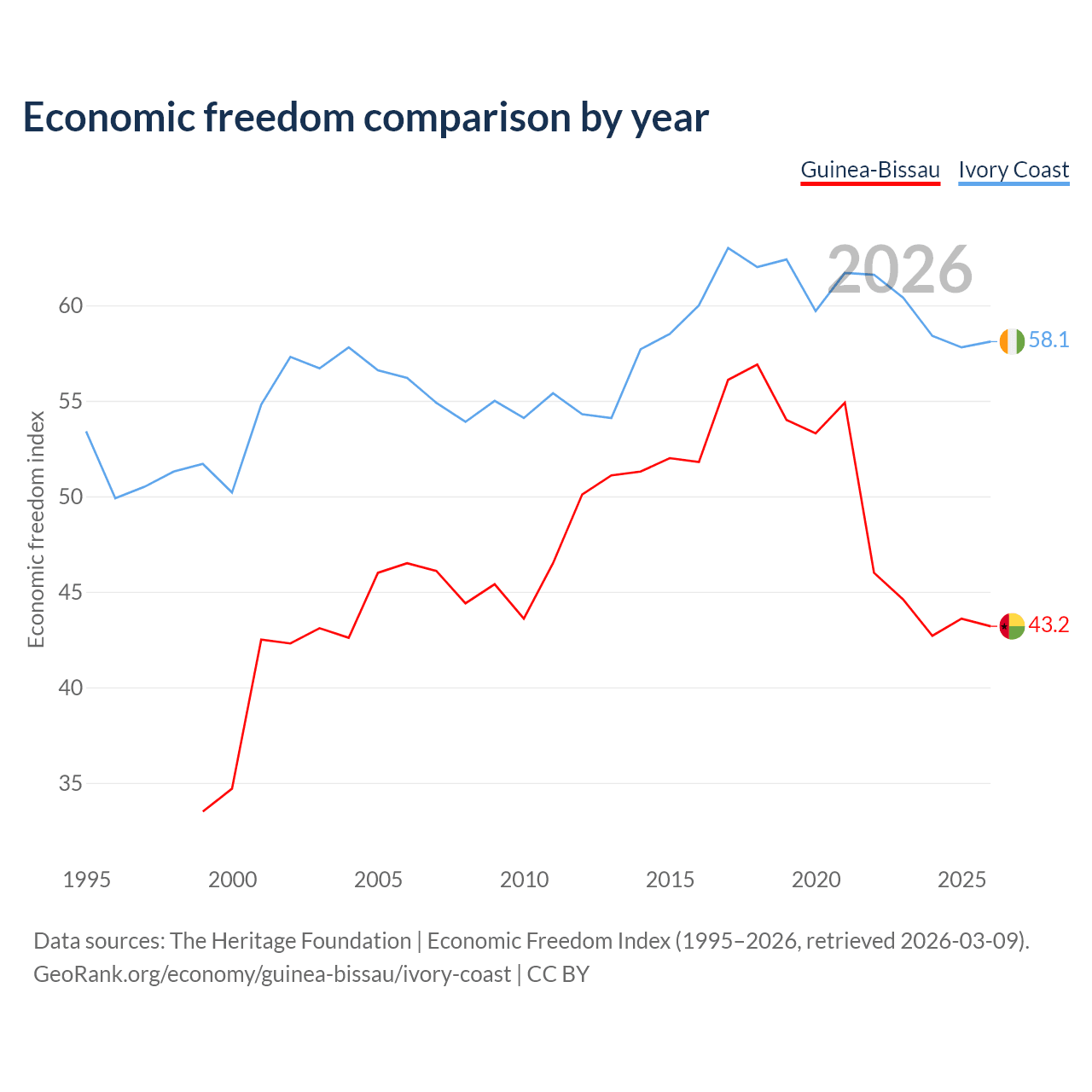 The Economic Freedom Index for Guinea-Bissau is 43.2, ranking 181/197, compared to 58.1 for Ivory Coast, ranking 111/197. The chart above displays a comparison of annual changes in economic freedom indexes.