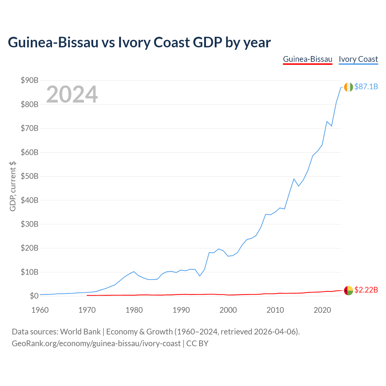 Guinea-Bissau has a GDP of $2.22B compared to $87.1B for Ivory Coast, ranking 176/197 and 77/197 by economy size, respectively.