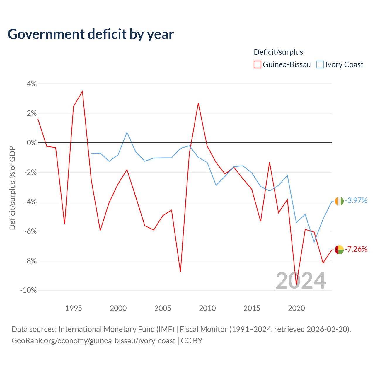 Guinea-Bissau has $1.82B in government debt (82.2% of GDP), compared to $51.6B (59.3% of GDP) in Ivory Coast.