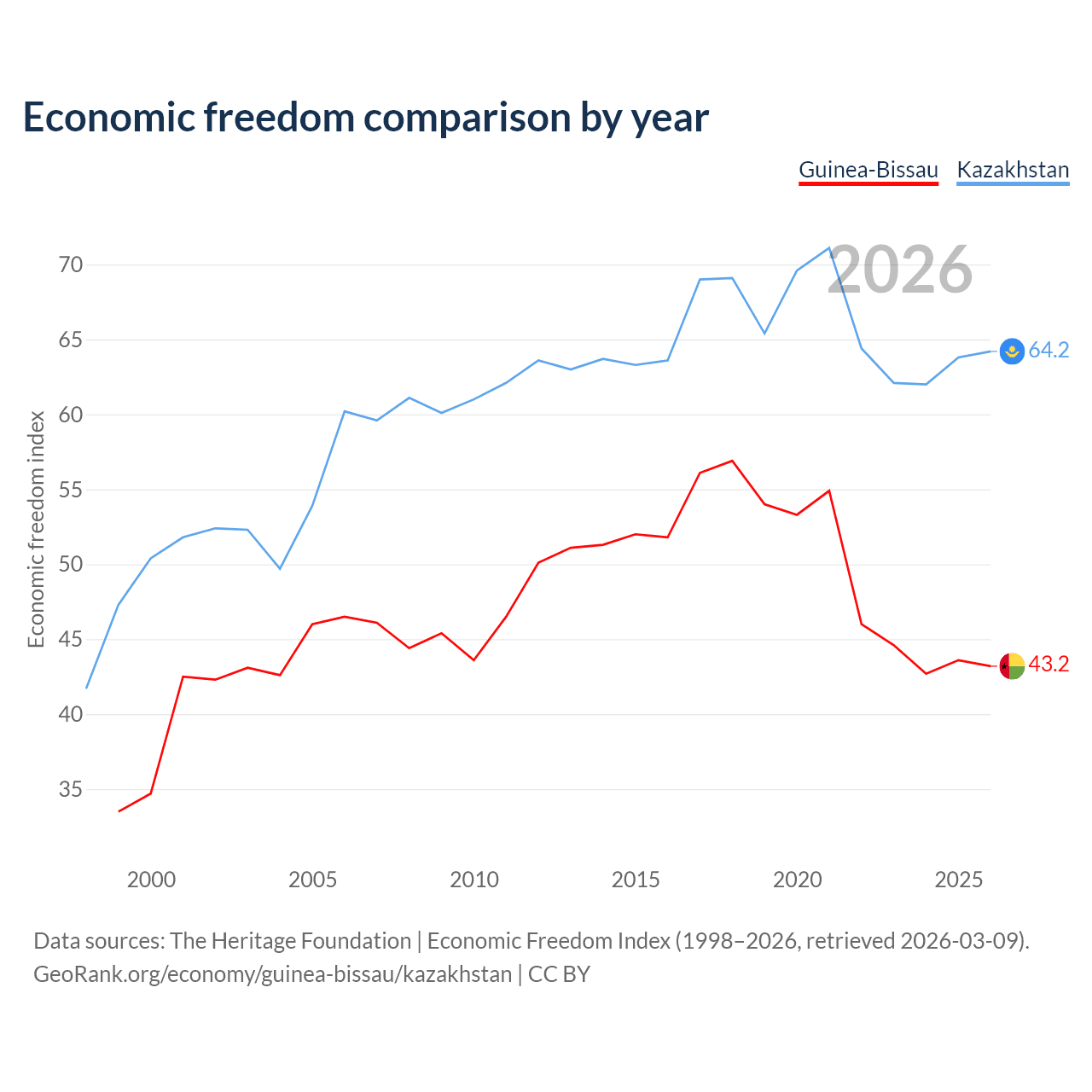 The Economic Freedom Index for Guinea-Bissau is 43.2, ranking 181/197, compared to 64.2 for Kazakhstan, ranking 75/197. The chart above displays a comparison of annual changes in economic freedom indexes.