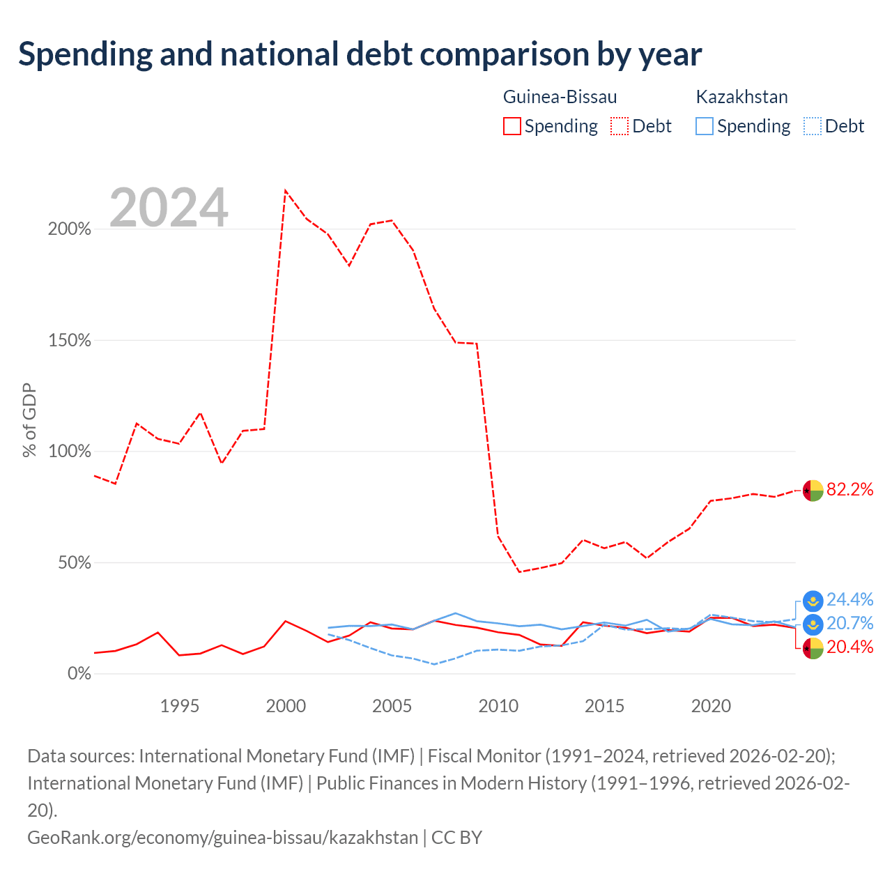 Guinea-Bissau has $1.82B in government debt (82.2% of GDP), compared to $71.1B (24.4% of GDP) in Kazakhstan.