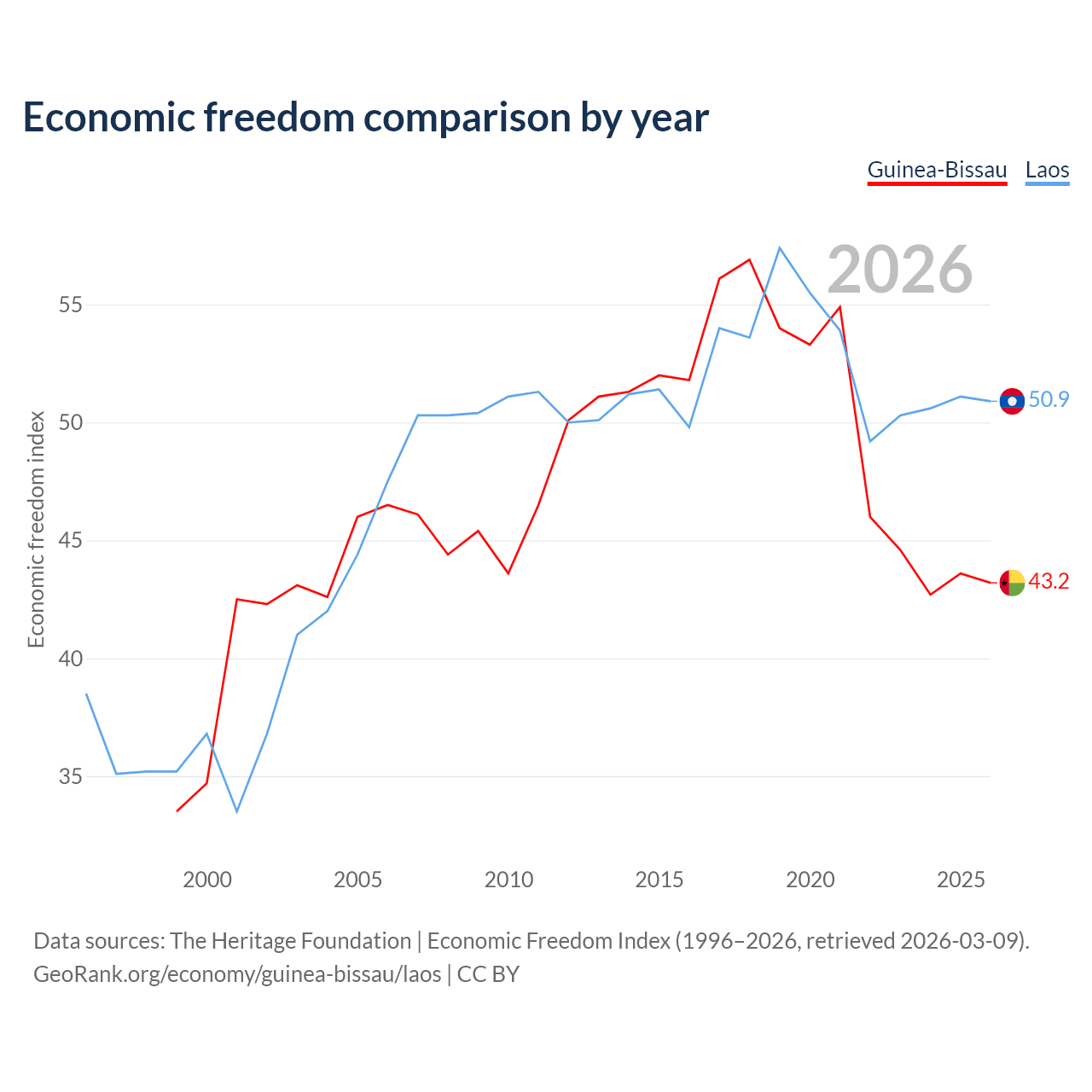 The Economic Freedom Index for Guinea-Bissau is 43.2, ranking 181/197, compared to 50.9 for Laos, ranking 157/197. The chart above displays a comparison of annual changes in economic freedom indexes.