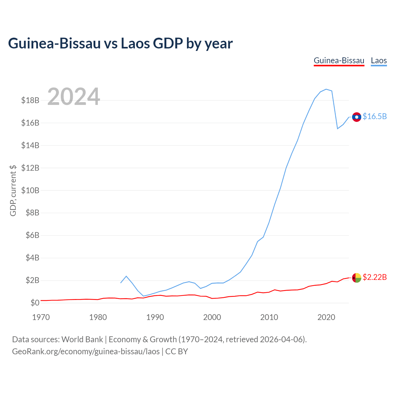 Guinea-Bissau has a GDP of $2.22B compared to $16.5B for Laos, ranking 176/197 and 139/197 by economy size, respectively.