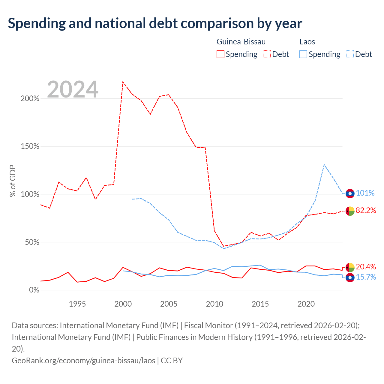 Guinea-Bissau has $1.82B in government debt (82.2% of GDP), compared to $16.6B (100.5% of GDP) in Laos.