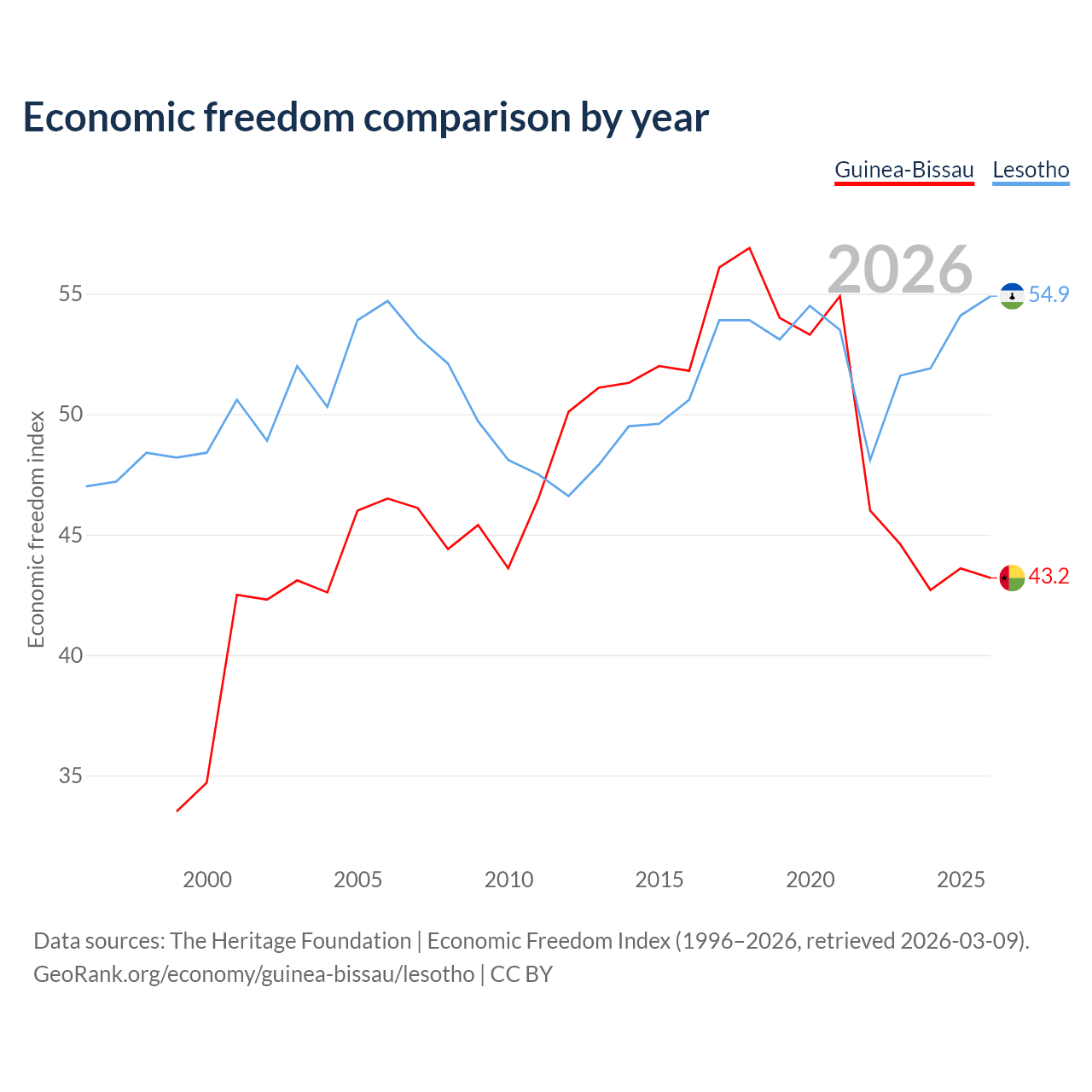The Economic Freedom Index for Guinea-Bissau is 43.2, ranking 181/197, compared to 54.9 for Lesotho, ranking 130/197. The chart above displays a comparison of annual changes in economic freedom indexes.