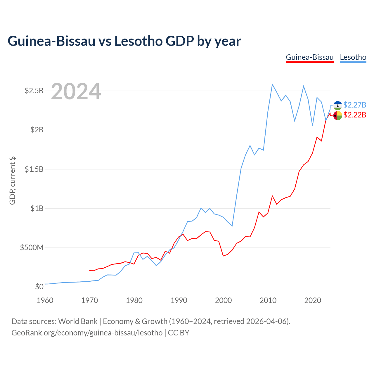 Guinea-Bissau has a GDP of $2.22B compared to $2.27B for Lesotho, ranking 176/197 and 175/197 by economy size, respectively.