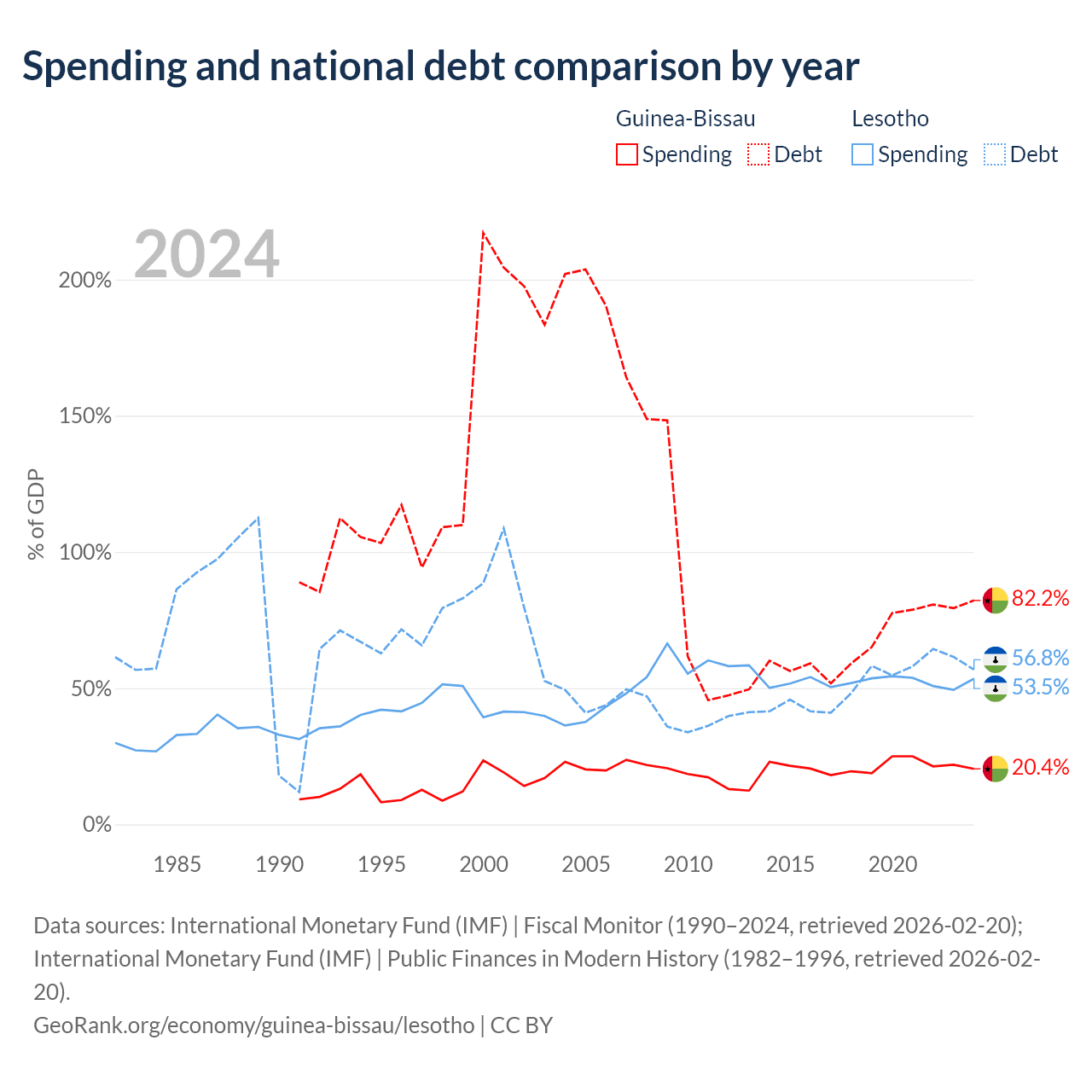 Guinea-Bissau has $1.82B in government debt (82.2% of GDP), compared to $1.29B (56.8% of GDP) in Lesotho.