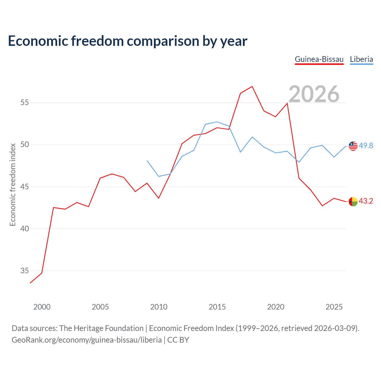 The Economic Freedom Index for Guinea-Bissau is 43.2, ranking 181/197, compared to 49.8 for Liberia, ranking 163/197. The chart above displays a comparison of annual changes in economic freedom indexes.
