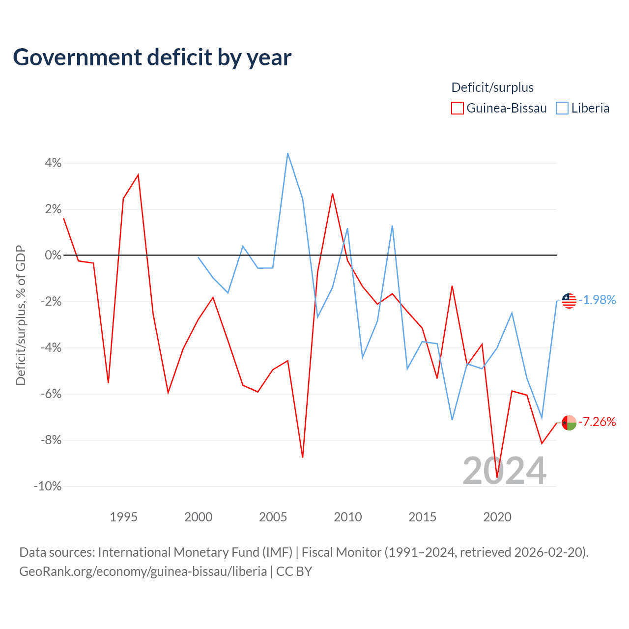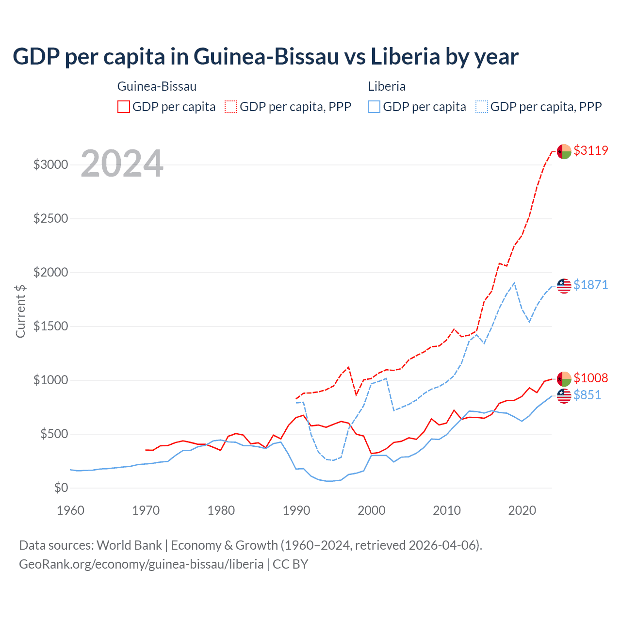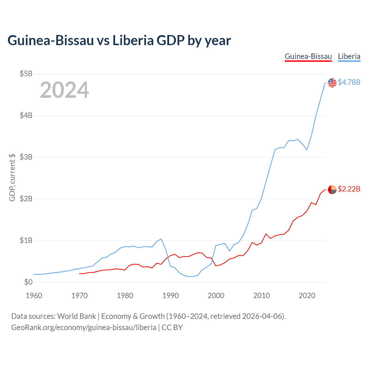 Guinea-Bissau has a GDP of $2.22B compared to $4.78B for Liberia, ranking 176/197 and 163/197 by economy size, respectively.