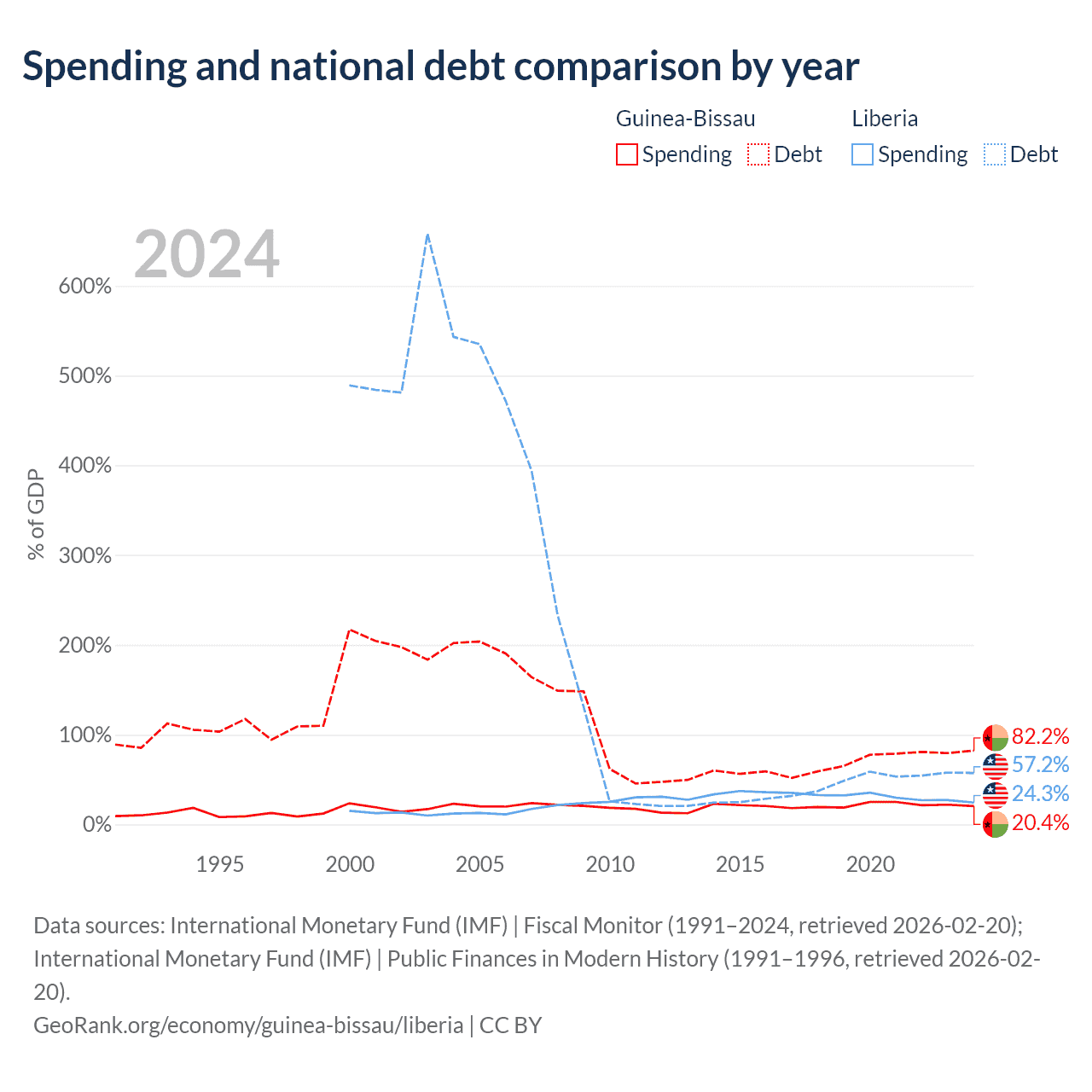 Guinea-Bissau has $1.82B in government debt (82.2% of GDP), compared to $2.73B (57.2% of GDP) in Liberia.