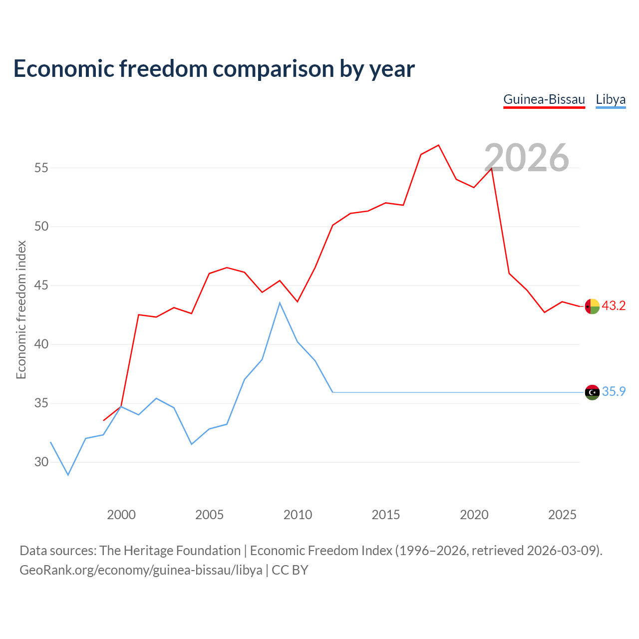 The Economic Freedom Index for Guinea-Bissau is 43.2, ranking 181/197, compared to 35.9 for Libya, ranking 189/197. The chart above displays a comparison of annual changes in economic freedom indexes.